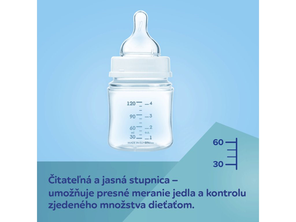 A széles nyak megkönnyíti a töltést és a mosást, a jól látható skála pedig a baba által elfogyasztott mennyiség ellenőrzését. Anti-kolikás cumit tartalmaz 0m+, mely formájával a lehető legjobban hasonlít az anyai mellbimbóhoz. Lehetővé teszi a baba szoptatását és cumisüvegből való táplálását egyszerre. A lezárt tömítőkoronggal ellátott palackban lefagyaszthatja vagy szállíthatja az ételt kiömlés veszélye nélkül. A palack nem tartalmaz BPA-t.