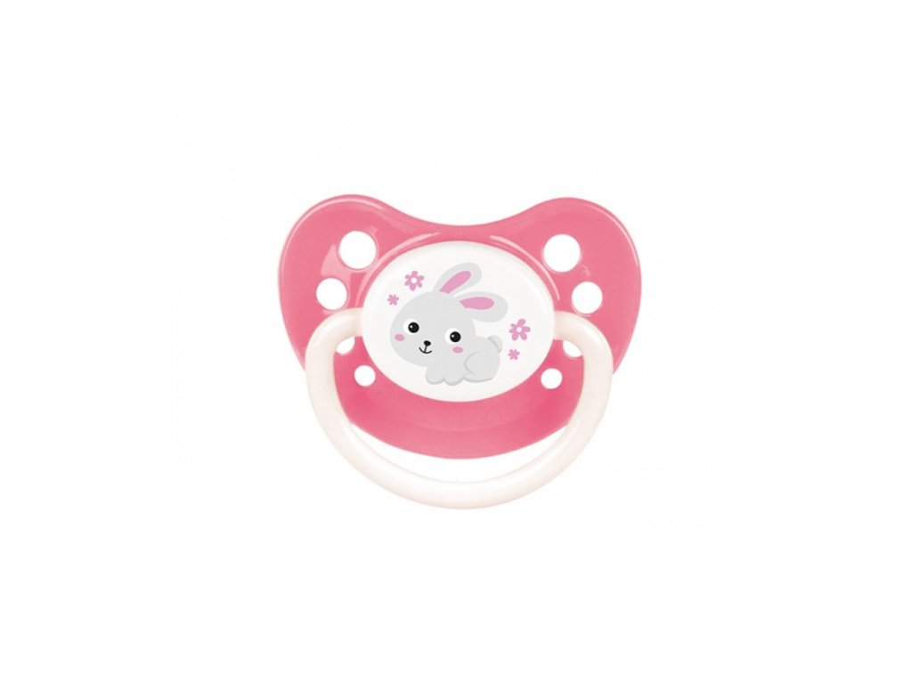 Szilikon cumi anatómiai formájú csúccsal, BUNNY & COMPANY nyomtatással. Tartalmaz egy sötétben világító fogantyút. A cumi nem tartalmaz BPA-t. A csomag 1 darabot tartalmaz.