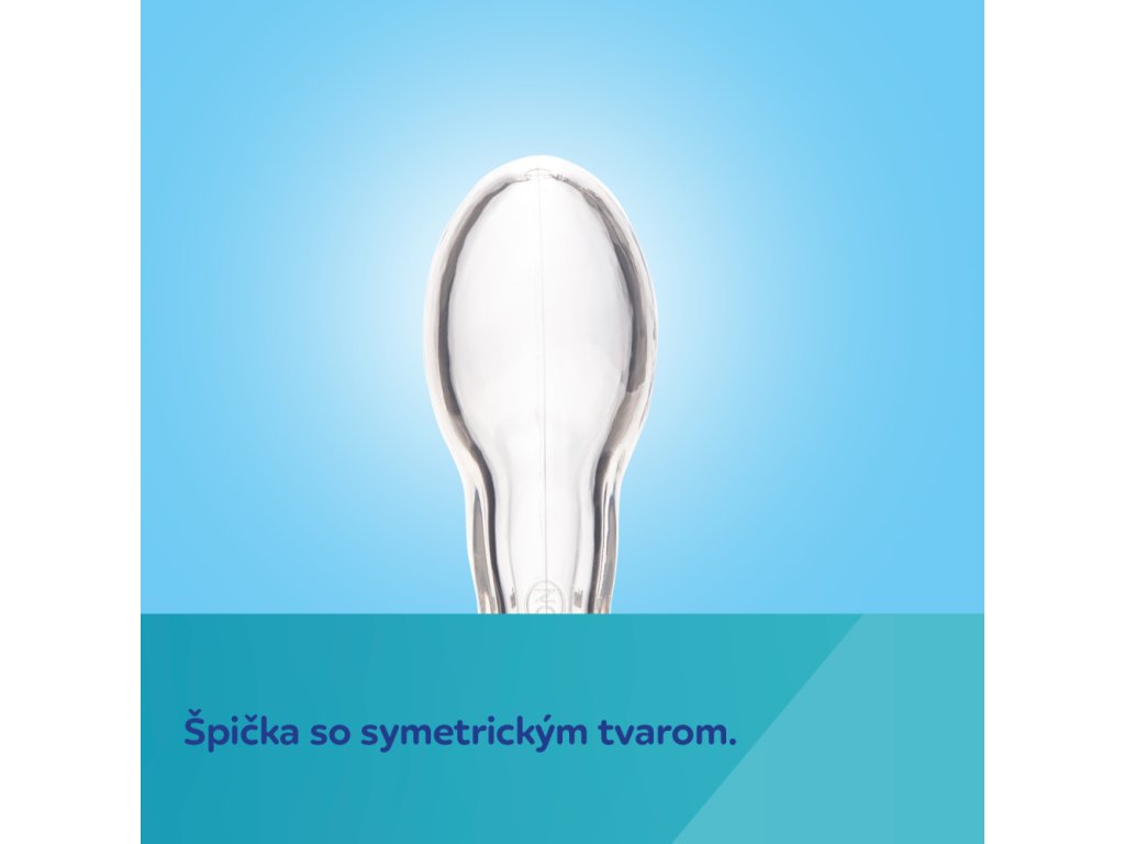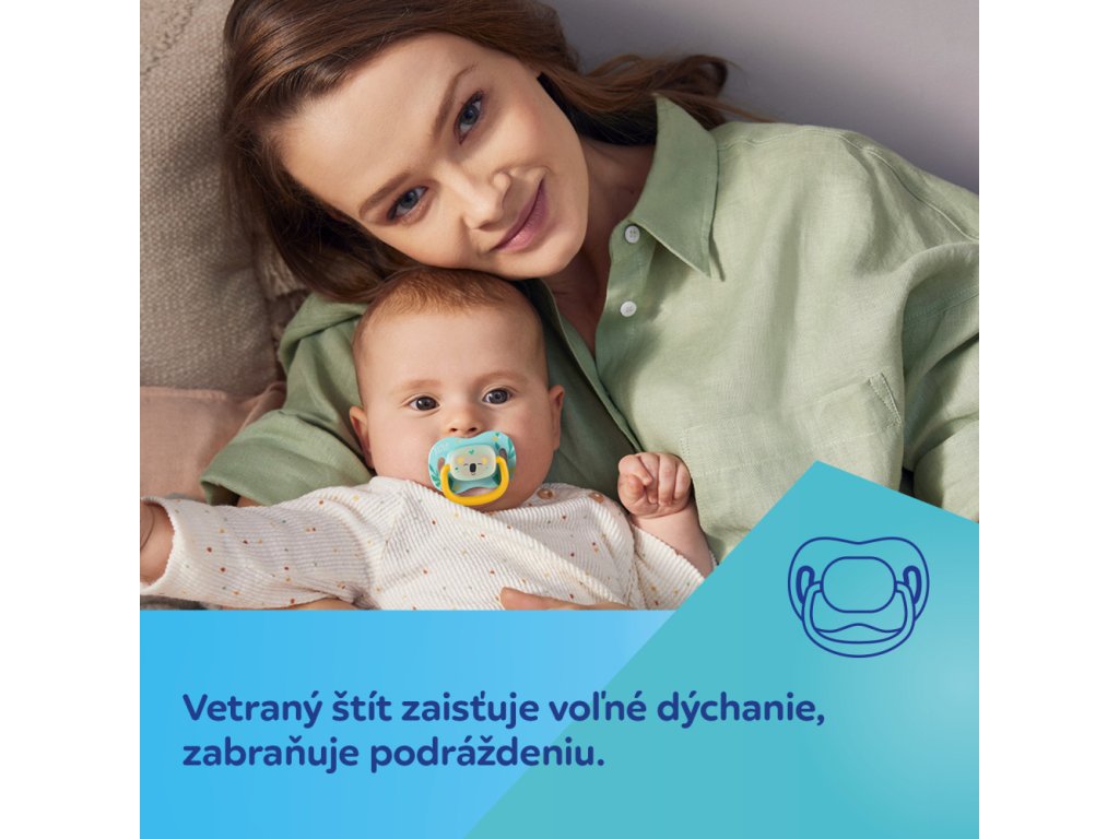 A pajzson lévő szellőzőnyílások biztosítják a szabad légzést és a nyál lenyelését. A pajzs speciálisan kialakított formája minimalizálja a cumi nyomait a baba finom arcán, és megakadályozza az irritációt. A cumi praktikus fogantyúja lehetővé teszi a cumi rögzítését és megkönnyíti a gyermeknek való átadását. A cumi közepe világít a sötétben, ami megkönnyíti a cumi megtalálását éjszaka.