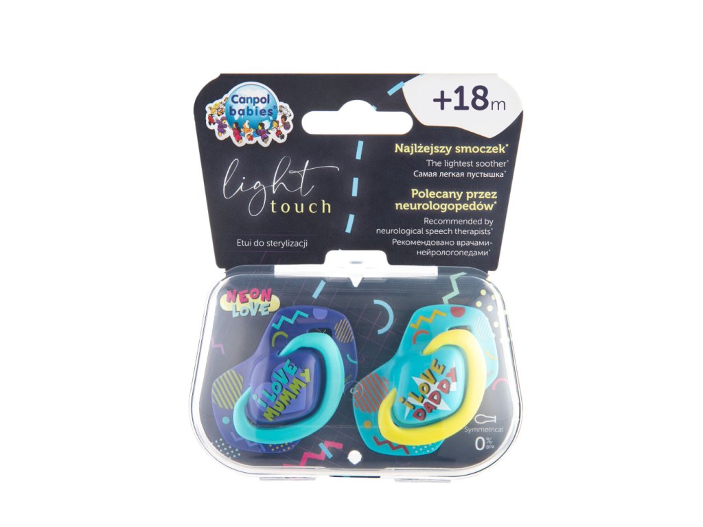 A Light touch cumik kicsik és könnyűek – a Canpol babies márka kínálatában a legkönnyebb cumik közé tartoznak. 18 hónapos kortól idősebb gyermekek számára készültek, nem tartalmaznak BPA-t, és a csomagolásban, sterilizáló kapszula formájában 2 db cumi található.
