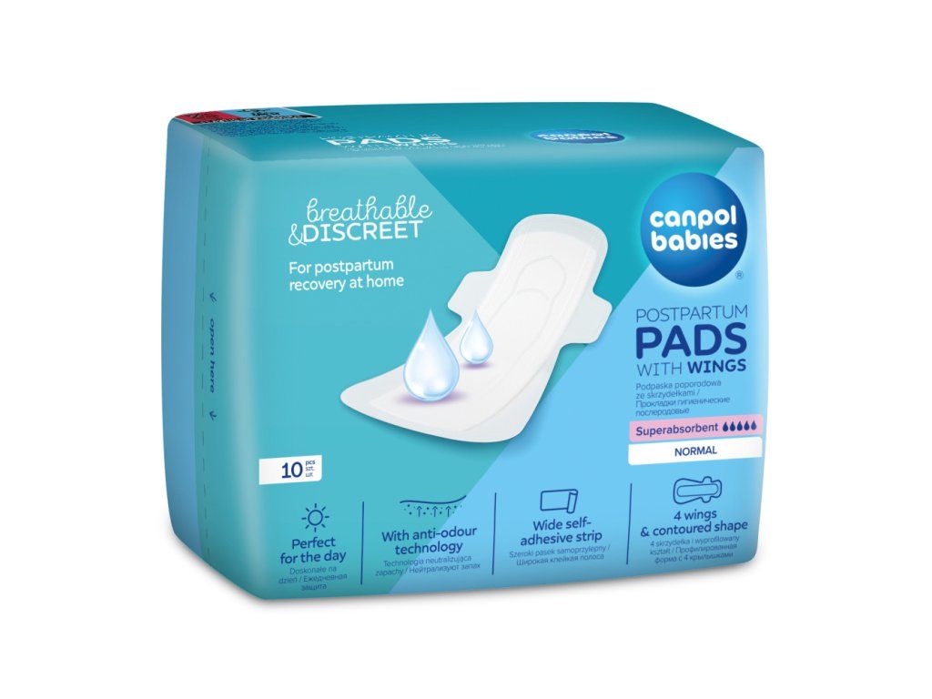 A Canpol Babies szuper nedvszívó szárnyas betétek ideális megoldást jelentenek a nők számára a gyermekszülés utáni időszakban, otthoni használatra a kórházból való távozás után. A szárnyas betétek vékonyabbak és diszkrétebbek, mint a hagyományos szülés utáni betétek, ugyanakkor rendkívül nedvszívóak és légáteresztőek.