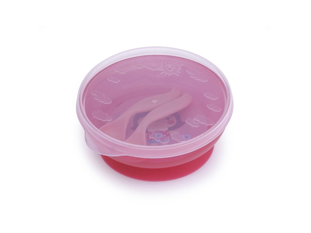 A műanyag, törésbiztos tál fedővel tökéletesen védi az ételt a gyors kihűléstől és a kiömléstől. Praktikus tapadókoronggal rendelkezik, amely megakadályozza az asztalon való elcsúszást. Ideális az önálló étkezés megtanulásához. Evőeszközkészletben kapható. Űrtartalom 350 ml.
