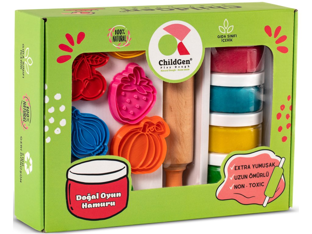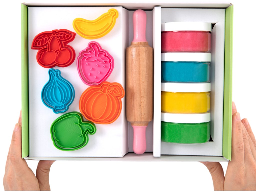 Kreatív gyurmakészlet Gyümölcs Kreatív készlet kis kezeknek Bemutatunk egy játékos és biztonságos módot gyermeke kreativitásának fejlesztésére – Kreatív gyurmakészlet Gyümölcs ChildGen. Ez a prémium készlet 100%-ban természetes és nem mérgező anyagokból készült, ami biztonságos és szórakoztató játékot garantál a kis alkotók számára.Hozzon létre saját fantáziadús kertet A készlet tartalma:4 színes tégely gyurma (sárga, rózsaszín, zöld, kék)12 tematikus kiszúró és pecsét gyümölcs- és zöldségmotívumokkal1 fa henger a modellezéshezA gyerekek különféle gyümölcsöket és zöldségeket készíthetnek, megtanulhatják felismerni őket, miközben fejlesztik finommotoros készségeiket és képzelőerejüket.Miért pont ezt a készletet válaszd? 100%-ban természetes összetételVegyszer- és tartósítószermentes: a legkisebbek számára is biztonságosSelymes textúra: könnyen formázható és kellemes tapintásúIdeális ajándék kis alkotóknak! Ez a készlet nagyszerű ajándék 3 éves kortól gyermekeknek. Akár születésnapra, karácsonyra vagy csak úgy örömszerzésre, minden kis művésznek örömet okoz. Ráadásul a természetes összetételnek köszönhetően hosszabb játék során is biztonságos.