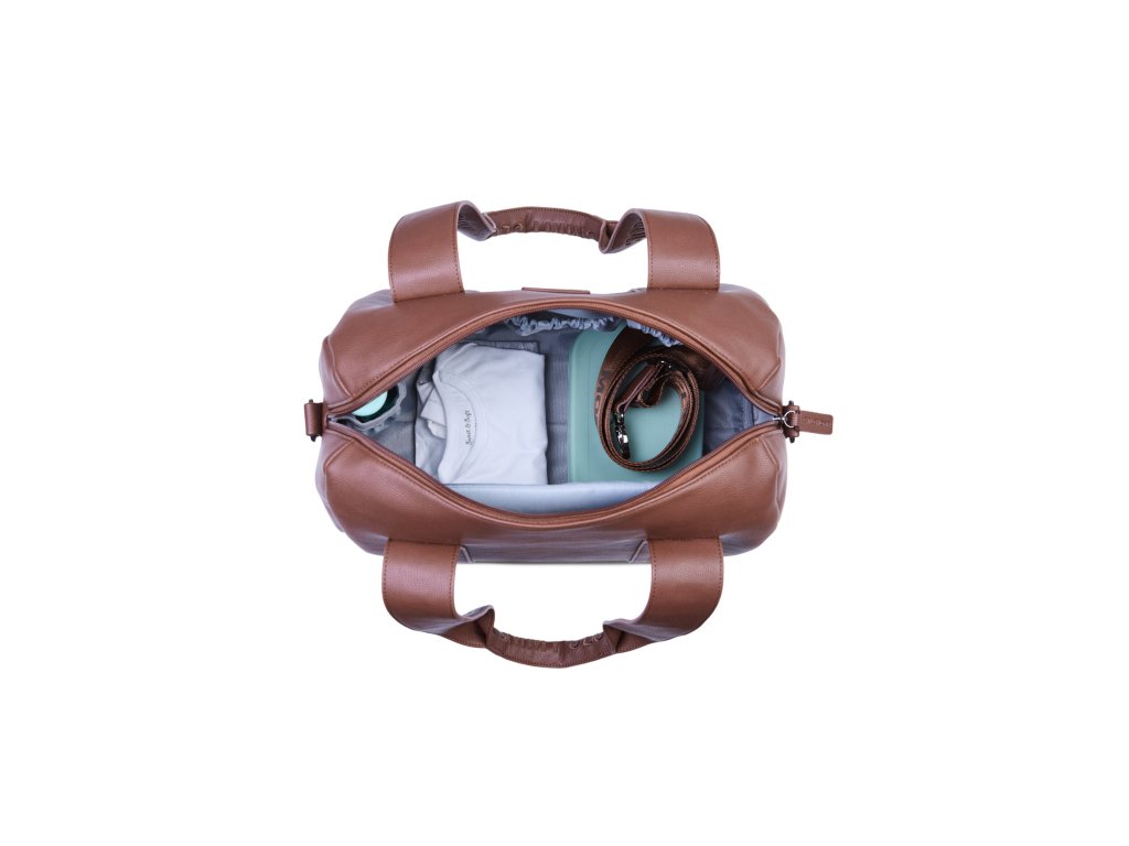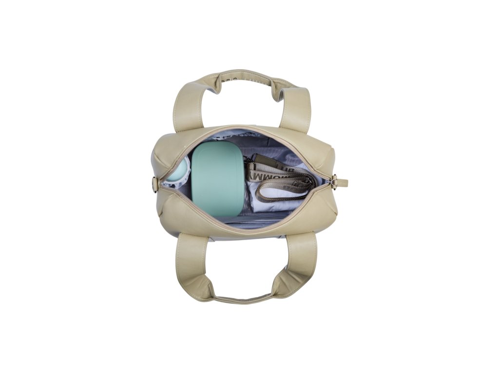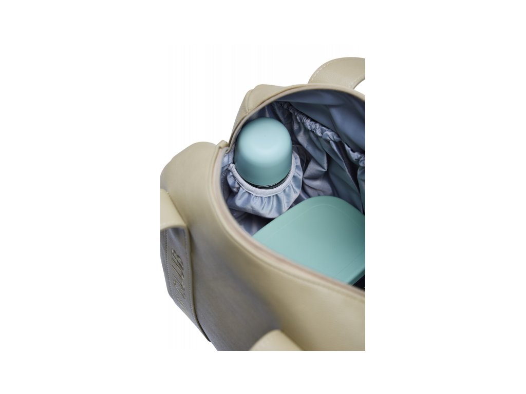 A cipzárral záródó pelenkázó táska fogantyúkkal van ellátva a kézben való hordozáshoz, pánttal a vállon való hordozáshoz és rögzítőkkel a babakocsira akasztáshoz.