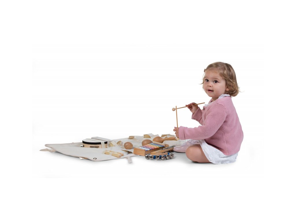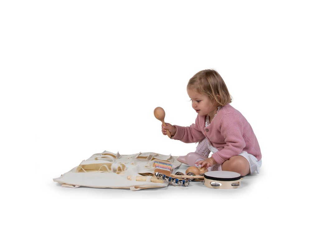 A készlet 8 hangszert tartalmaz: tamburint, ütőhangszereket, rumbatököt, csörgő tojásokat, xilofont, kézi csörgőt, triangulumot és kézi csengőket.