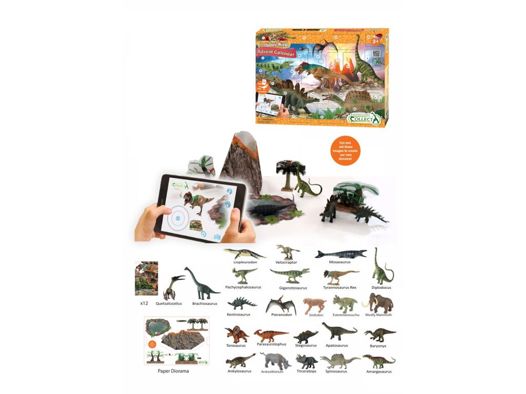 Az adventi naptár kellemesebbé teszi a várakozást a Jézuskára. December 1-től 24-ig minden nap egy-egy dinoszaurusz figura teszi kellemesebbé a várakozást. Az adventi naptár 12 kártyát tartalmaz, amelyek segítségével mozgásba hozhatod a dinoszauruszokat. Hogyan kell csinálni? Töltsd le a CollectA AR alkalmazást a mobiltelefonodra vagy a tabletedre. Nyisd meg az alkalmazást, és irányítsd a telefonodat vagy a tabletedet az állatos kártyára. Az állat elkezd mozogni. A nyilak segítségével irányíthatod a mozgását. Oda fog menni, ahova szeretnéd. Meg is simogathatod. A „nyitott száj” gombbal vezérelheted a hangeffektusokat. Az „i” gomb az állatról szóló információkat rejti angol nyelven. Le is fényképezheted az állatot. A fényképek a telefon vagy a tablet galériájába kerülnek mentésre.