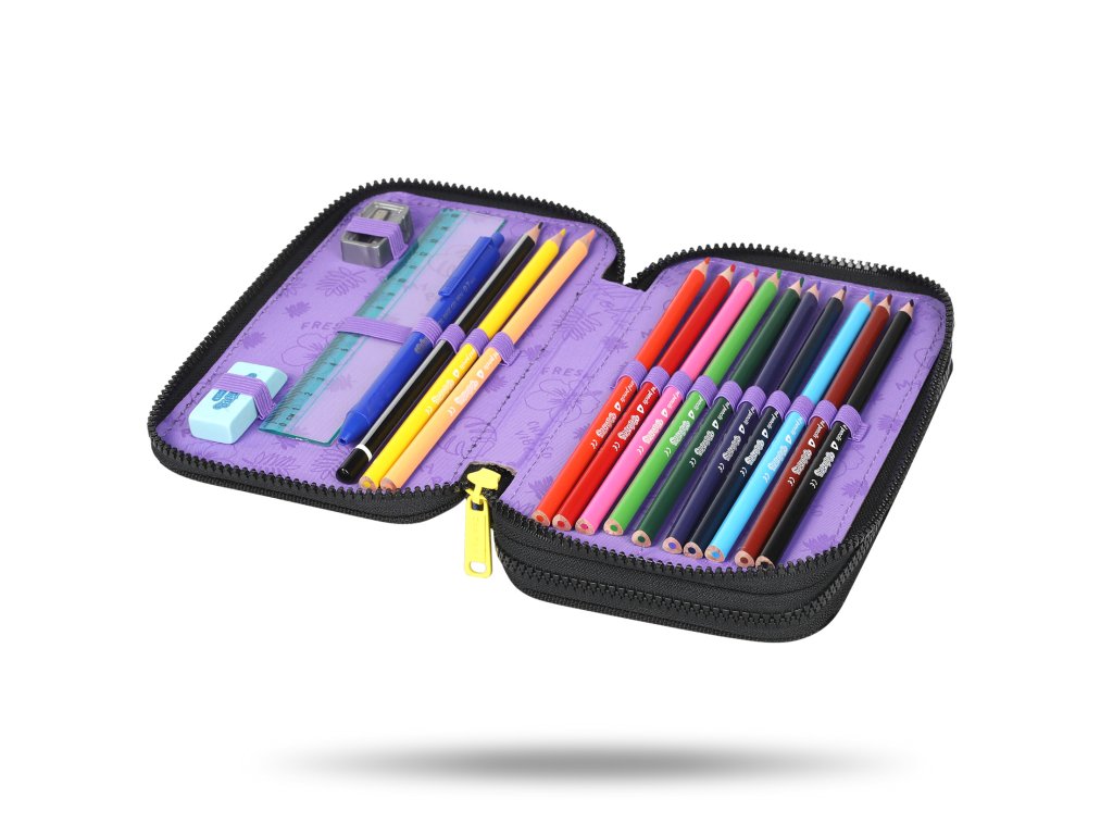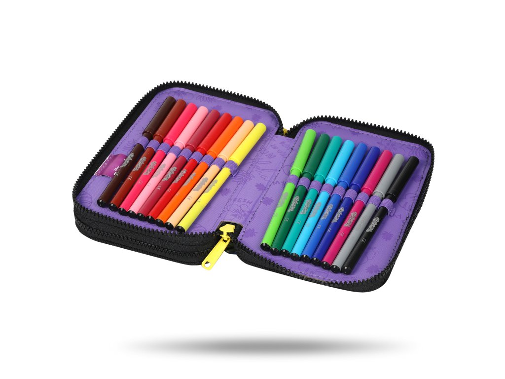 Jumper kétszintes Stitch Black tolltartó Minden, ami az íráshoz és alkotáshoz szükséges egy praktikus tolltartóban A Jumper Stitch Black tolltartó egy kétszintes szervező gyerekeknek, amely mindent tartalmaz, ami az íráshoz és rajzoláshoz szükséges. A tartós, kontrasztos szegélyű cipzárnak köszönhetően ideális iskolások számára. A gumiszalagok a helyükön tartják az írószereket, míg a felszerelés, mint a filctollak, színes ceruzák és ceruzák biztosítanak mindent, ami a gyerekeknek a kreatív tevékenységekhez szükséges.Tartalom:18× filctoll12× színes ceruza1× háromszögletű HB ceruza 1× 0,7 mm-es gélhenger 1× 15 cm-es vonalzó 1× radír 1× hegyező
