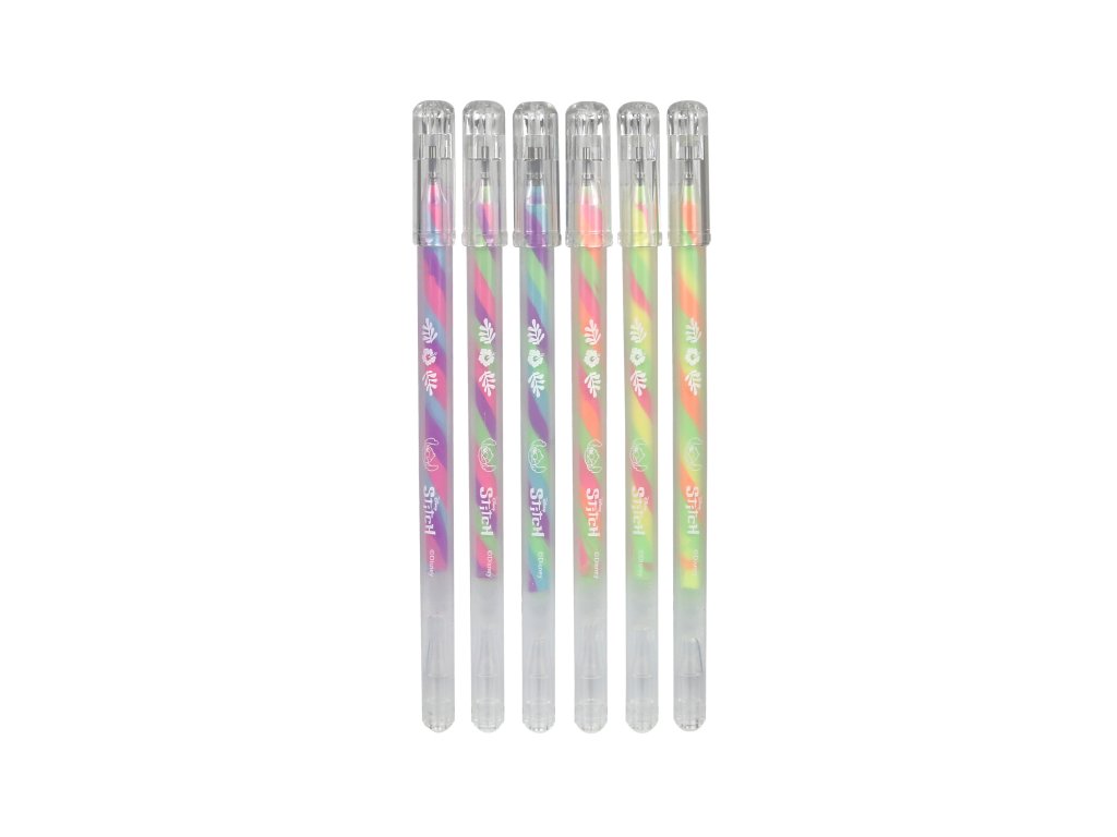 Stitch Pastel gél tollak 6 db Tökéletes kiegészítője minden iskolás tolltartójának. Adj egy jó adag stílust és színt a jegyzeteidhez, a naplódhoz vagy a kreatív projektjeidhez! A Stitch Pastel gél tollak a funkcionalitás és a design tökéletes kombinációja. A készlet 6 db finom pasztell árnyalatú tollat tartalmaz a népszerű Stitch motívummal. A sima írásuk és az intenzív színeik minden oldalt műalkotássá varázsolnak. Ideális iskolába, íráshoz, rajzoláshoz vagy színezéshez. A minőségi tintának, a praktikus lehajtható kupaknak és az 1 mm-es vastagságnak köszönhetően minden toll örömöt okoz a használat során.