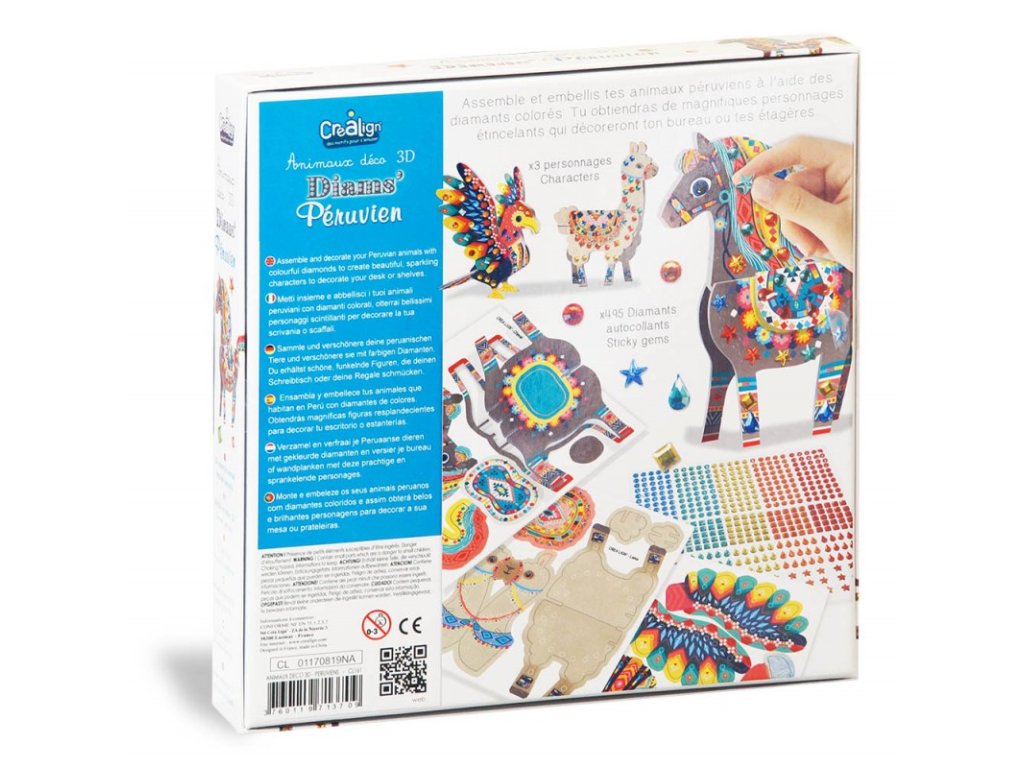 3D állatok Gyémánt mozaik Perui állatok 5+ Készíts csillogó állatokat Peruból! Egyedülálló kreatív készlet gyémánt matricákkal és 3D állatokkal a francia Crea Lign márkától, 5 éves kortól ajánlott gyermekeknek. 3 állatot tartalmaz az összeállításhoz és 495 gyémánt matricát. A gyerekek először összeállítják az állatok figuráit, majd gyönyörűen feldíszítik őket felragasztható kövekkel. Befejezés után dekorációként állítják ki őket.A Crea Lign segítségével a gyerekek új művészeti technikákat tanulnak, a 3D gyémánt mozaik fejleszti a finommotorikát, a képzelőerőt és a kreativitást. A termék kiváló minőségű és biztonságos, akárcsak a francia Crea Lign márka összes többi terméke. Célja, hogy olyan kreatív kellékeket és játékokat fejlesszen, amelyek támogatják a gyermekek fejlődését, és lehetővé teszik számukra, hogy megtalálják azt, amit élveznek.