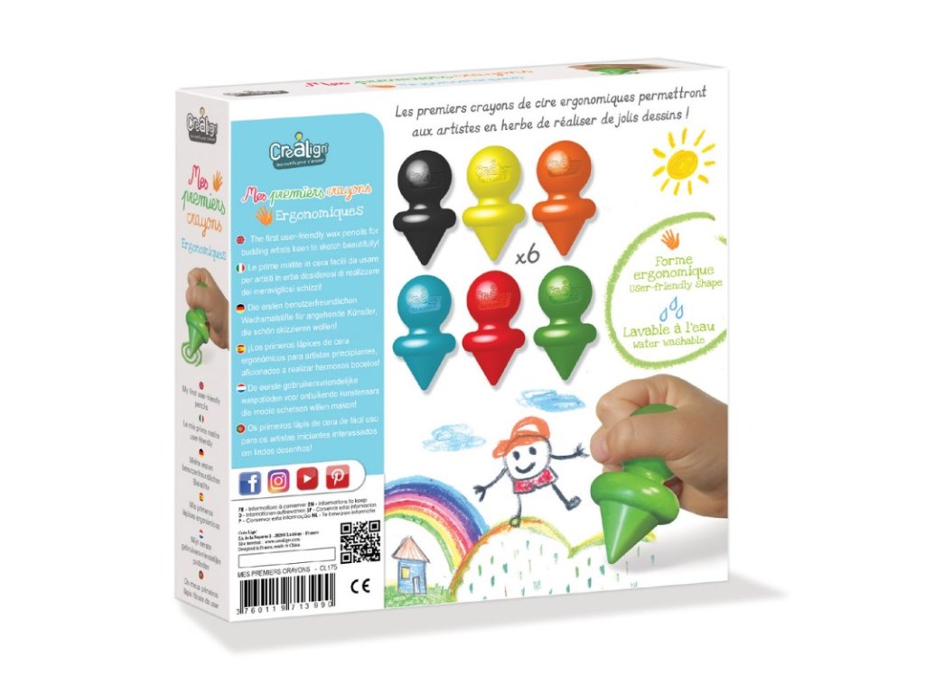 Az első zsírkrétáim 6 db Ergonomikus zsírkréták a legkisebbeknek! Az első zsírkrétáim a legkisebb gyermekek számára a francia Crea Lign márkától nagyok és ergonomikus kialakításúak. Jól illeszkednek a kis kezekbe, és ennek köszönhetően már 12 hónapos kortól alkalmasak a gyermekek számára. A szennyeződéstől sem kell tartani. Könnyen lemoshatók a kezekről és kimoshatók a ruhákból. Összetételük biztonságos a gyermekek számára.Nagyszerű a kreativitás fejlesztésére A legkisebbeknek szánt zsírkréták támogatják a grafomotoros készségek, a helyes fogás és a kreativitás fejlesztését. Sokáig tart, és a 6 alapszínt tartalmazó csomag teljesen elegendő a legkisebb művészek számára. A termék kiváló minőségű és biztonságos, akárcsak a francia Crea Lign márka összes többi terméke. Célja, hogy olyan kreatív kellékeket és játékokat fejlesszen, amelyek támogatják a gyermekek fejlődését, és lehetővé teszik, hogy mindenki megtalálja azt, amit élvez.