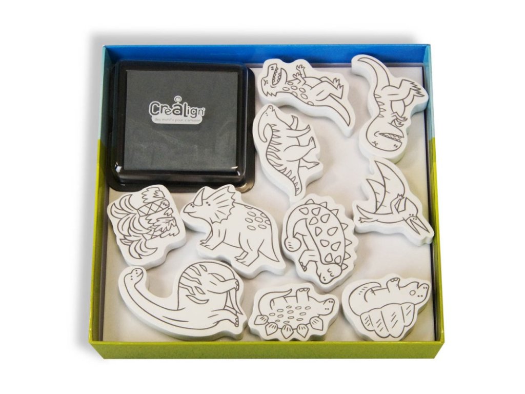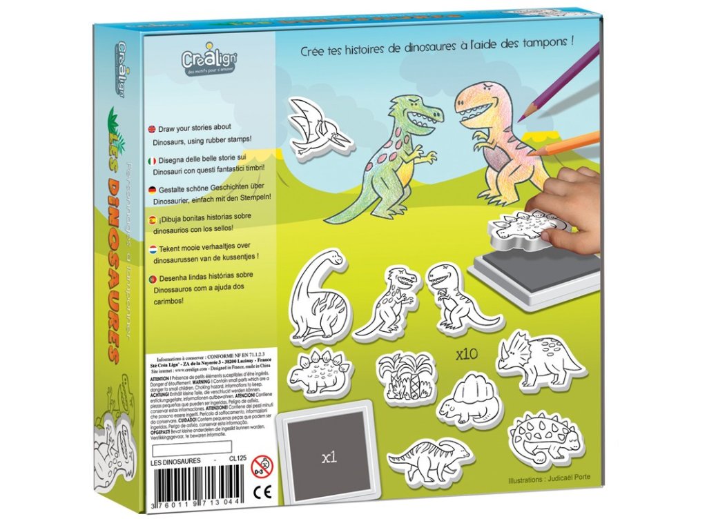 Dinoszauruszos bélyegzők – Találj ki egy saját dinoszauruszos történetet! A Crea Lign francia márka bélyegzőkészlete gyerekeknek 10 nagy dinoszauruszos és növényes habszivacs bélyegzőt tartalmaz. A gyerekeknek köszönhetően kitalálhatják saját rajzfilm dinoszauruszos történetüket. A gyerekek lepecsételik és a körvonalakat a saját képzeletük szerint színezik ki. A csomag tintapárnát is tartalmaz fekete színnel. A gyerekek így azonnal alkothatnak!A Crea Lign segítségével a gyerekek új művészi technikákat tanulnak A gyermekbélyegzők és a velük való munka támogatja a finommotoros készségek, a gondoskodás, a képzelőerő és a kreativitás fejlesztését. A termék kiváló minőségű és biztonságos, akárcsak a francia Crea Lign márka összes többi terméke.