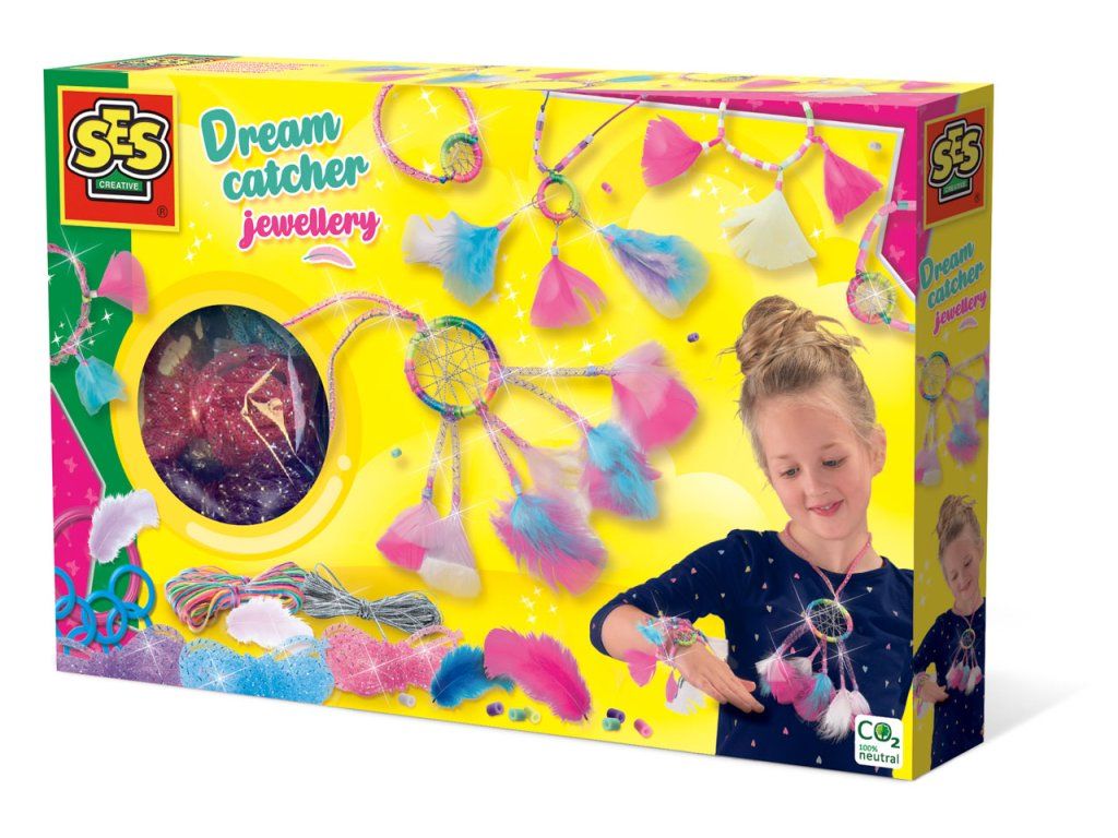 Álomfogók nem csak szórakozás a hálószobában, hanem ékszerként is viselheted! Ezzel az álomfogó ékszerkészítő készlettel gyönyörű karkötőket és nyakláncokat készíthetsz. Használd a mellékelt tollakat, gyöngykeveréket, szatén zsinórt és egyéb tárgyakat egyedi alkotások létrehozásához. Remek alkalom barátokkal együtt alkotni. A készlet tartalma: 9 álomfogó karika, tollak, 3 csillogó gyöngy, 400 gyöngy, szatén zsinór, hímzőfonal. Életkor: 5+