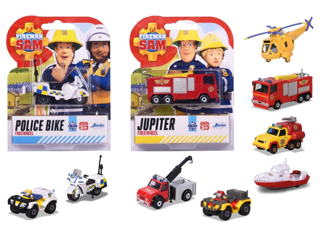 Szabadonfutó fém autó a Sam, a tűzoltó sorozat hőseivel, 1:64 cm méretarányban. 8 féle: Jupiter, Mercury, Wallaby, Titan, Venus 2.0, Phoenix, rendőrmotor és rendőr Mercury.