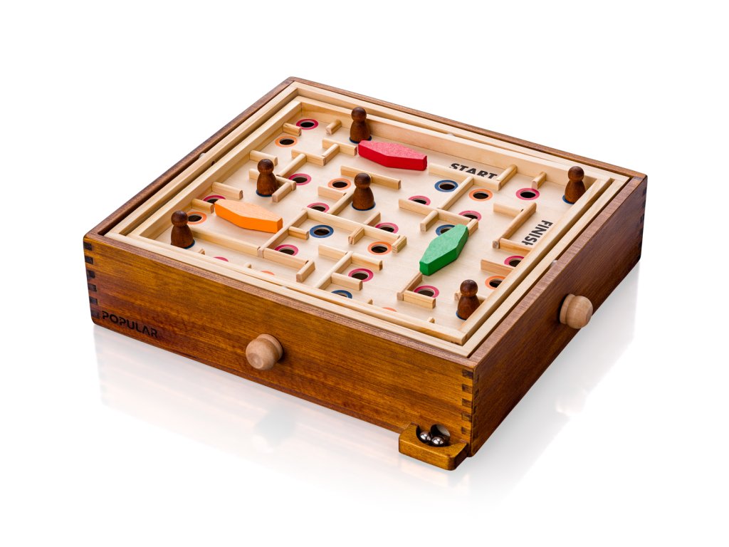 A két oldalsó kerékkel döntsd meg a labirintussal ellátott síkot úgy, hogy a golyó az indítástól a célig jusson anélkül, hogy a lyukakba esne. A labirintus útvonalát lerövidítheted vagy meghosszabbíthatod a 3 forgatható ütköző segítségével, amelyek új teret határolnak számodra. Az útvonal nehézségét megkönnyítheted a mellékelt csipeszekkel, amelyek tetszőlegesen kiválasztott lyukakba helyezve megakadályozzák a golyó leesését. | Ajánlott életkor: 5+| Termék méretei: 28,5 x 32 x 7,5 cm