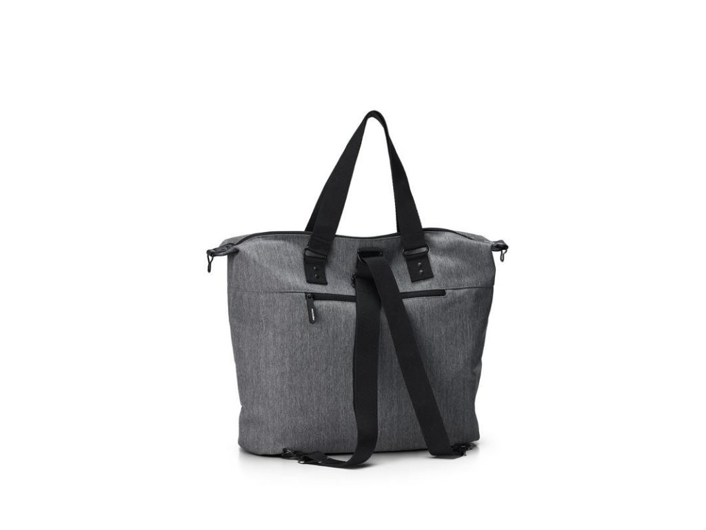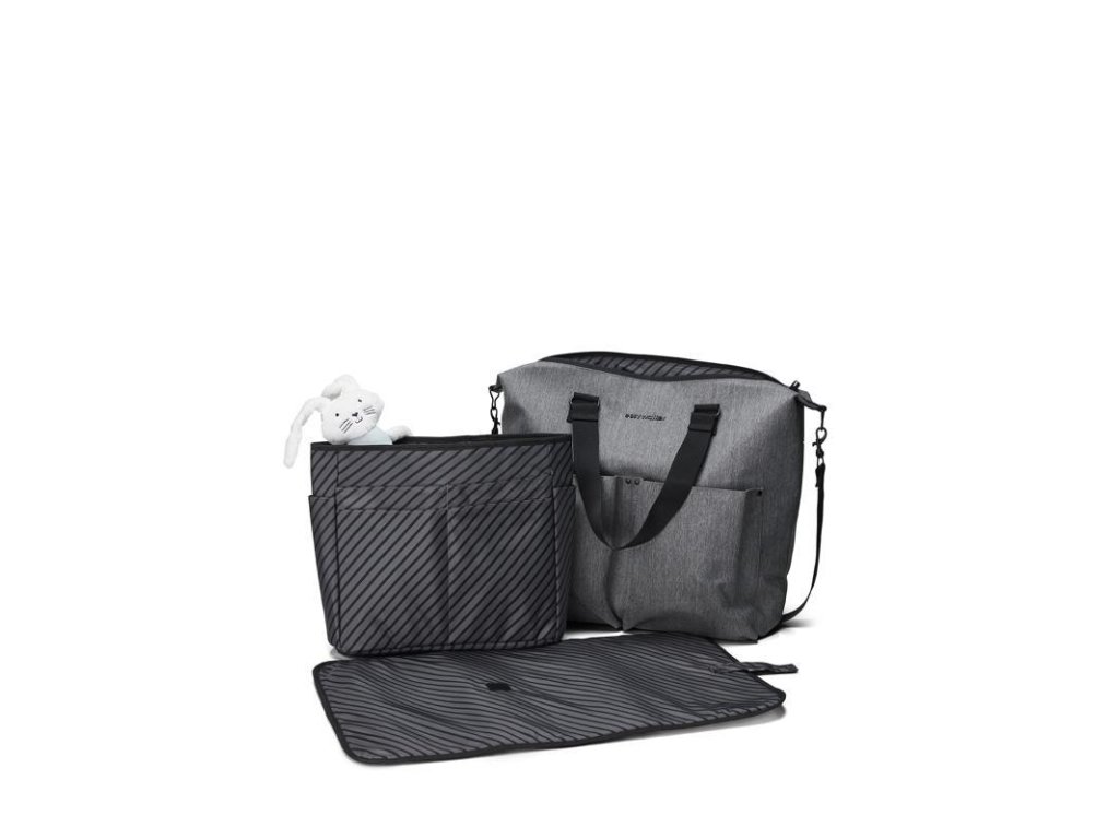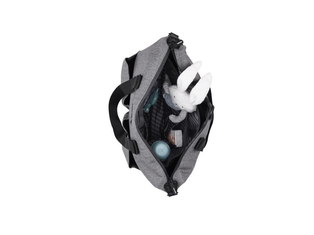 A pelenkázótáska két könnyen hozzáférhető külső zsebbel és egy cipzárral zárható zsebbel rendelkezik. A levehető vállpánt állítható, hogy minden testmérethez megfeleljen. Belül két rekeszt talál a textilpalackok számára, amelyek útközben melegen vagy hidegen tartják a baba italait. Tartalmaz egy praktikus pelenkázó alátétet és egy kis szervezőt (táskát) is.