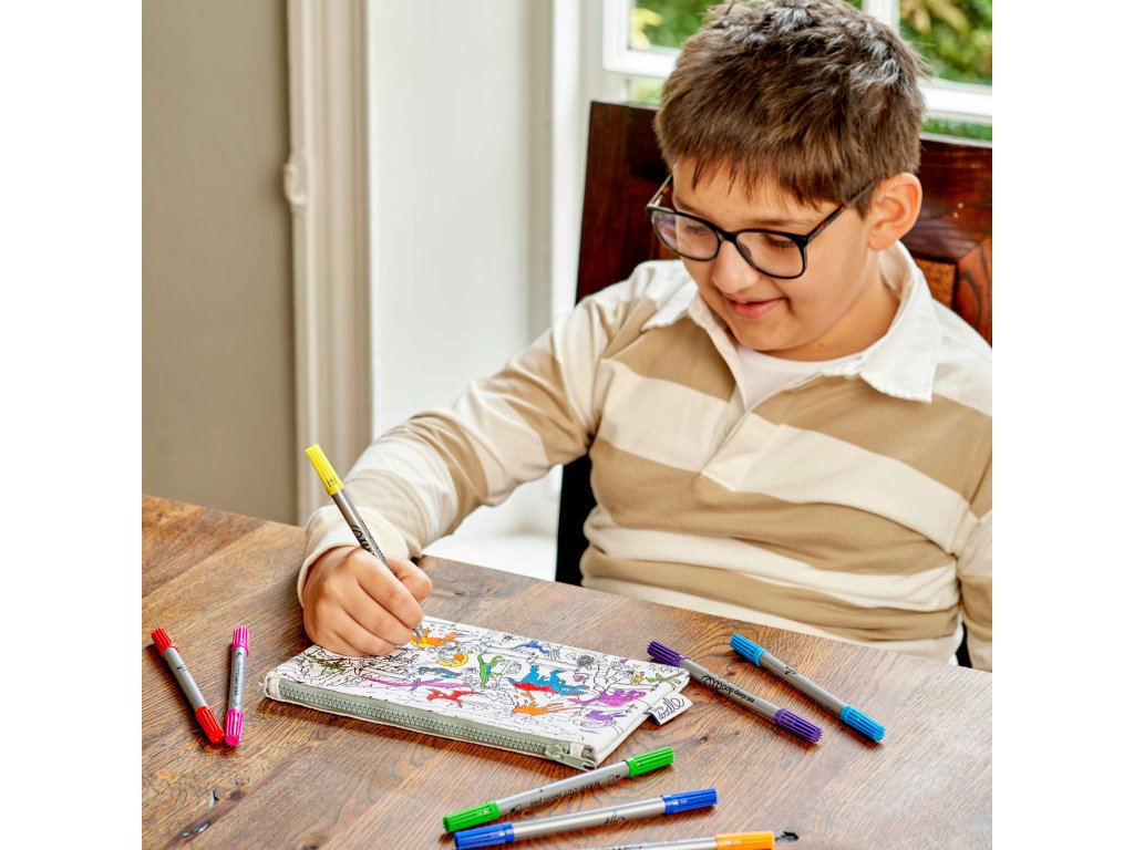 Díszítsd és mosd ki tolltartó DinoGazdagítsd iskolai felszerelésed kreatív színekkel!Ezzel az eredeti Dino színező tolltartóval minden gyermek elindulhat a saját felfedező útjára. A dinoszauruszok felfedezése, a tanulás róluk és a saját tervek készítése soha nem volt még ilyen szórakoztató! A tolltartó másik oldalán helyet találsz saját történeted megírására, ami támogatja a kreativitást és az írásfejlesztést.Használja a mellékelt mosható filctollakat, és készítse el saját színes képét. És ha a küldetés teljesítve, egyszerűen mossa ki a mosógépben – a tinta eltűnik, és a tolltartó készen áll a következő felfedezésre!Miért fogják a gyerekek imádni a Dino tolltartót?Fejleszti a kreativitást, a kíváncsiságot és a fantáziátJátékos formában tanítja a gyerekeket a dinoszauruszok világának megismeréséreMosható és újrafelhasználható – végtelen szórakozásIdeális iskolásoknak, kis kreatív elméknek és dinoszauruszok szerelmeseinekNagyszerű ajándék születésnapra vagy az iskola kezdetére