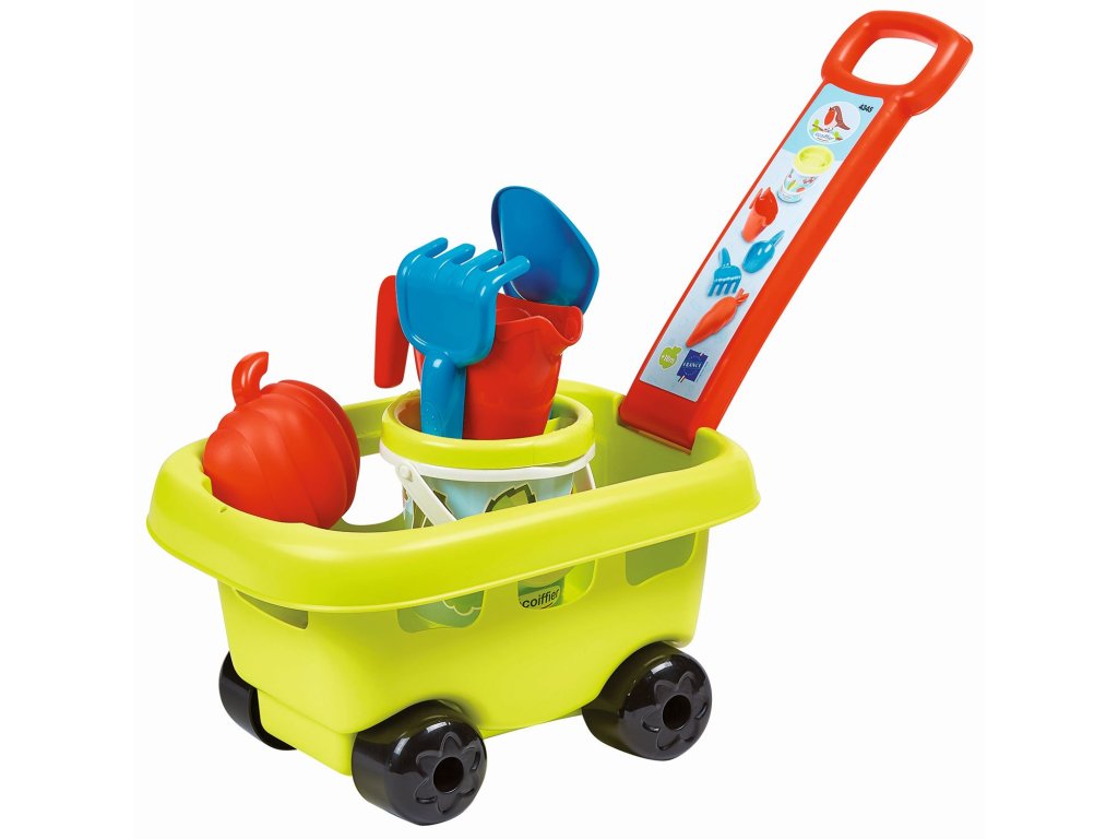Kézi kerti kocsi vödörrel és tartozékokkal. Homokozó vödörrel, szitával, locsolókannával, lapáttal, gereblyével és homokozó formával. A kocsit a praktikus fogantyúnak köszönhetően könnyű irányítani. Termék méretei (H×Sz×M): 31 × 19 × 17,5 cm.