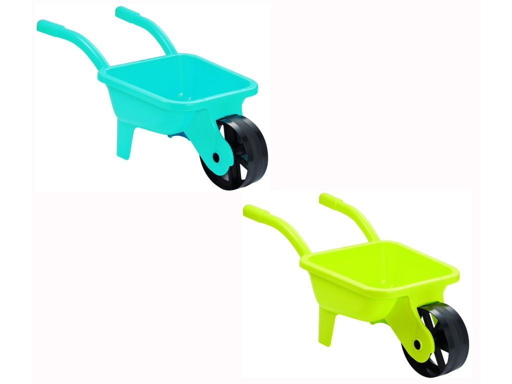 Sárga vagy kék kerti talicska. Méretek 66 x 28 x 28 cm.