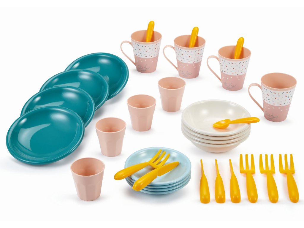 Az edénykészlet tányérokat, desszertestányérokat, tálakat, bögréket, poharakat és evőeszközöket tartalmaz. Összesen 32 db. Praktikus, fogantyús dobozba csomagolva a könnyű szállítás érdekében a kertbe, látogatóba stb. A doboz egyben kiszolgáló asztalként is szolgál.