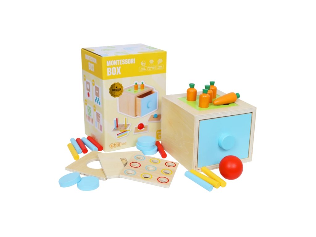 Montessori box 4 az 1-ben A legjobb multifunkcionális játék a gyermekek fejlődéséhez A Montessori játékok arról híresek, hogy a játékon keresztüli tanulással támogatják a gyermekek természetes fejlődését. A Montessori doboz egy eredeti multifunkcionális játék, amely négy különböző felhasználási módot kínál a gyermek aktuális fejlődési szakaszának megfelelően. A fiókos fa doboz cserélhető tetővel rendelkezik, ami lehetővé teszi a gyermekek számára, hogy változtassák az aktuális játékot. Milyen típusú beillesztő játékokat talál a montessori dobozban?1) golyó bedobása - 12 hónapos kortól alkalmas2) érme bedobása - 12 hónapos kortól alkalmas3) répa bedobása - 15 hónapos kortól alkalmas4) színes pálcikák bedobása - 24 hónapos kortól alkalmas - a gyermek először megtanulja a pálcikát bármelyik lyukba bedobni. Később nehezebbé teheti a játékot, és a gyermeknek ugyanabban a színben kell eltalálnia a lyukat, mint a pálcika. A sokoldalú Montessori játék együtt nő a gyermekkel. A Montessori box több területen is támogatja a gyermekek fejlődését. Játék közben a gyermekek fejlesztik finommotoros készségeiket, szem-kéz koordinációjukat, és megtanulják felismerni a színeket és formákat, ezáltal fejlesztve logikai gondolkodásukat is. A játékon keresztüli tanulás lehetőséget ad számukra, hogy sikert érjenek el minden helyesen behelyezett tárggyal, ami támogatja az önbizalmukat. Ez a 4 az 1-ben beillesztő játék lehetővé teszi a gyermekek számára, hogy fejlesszék a válogatási és formafelismerési készségeket, amelyek fontos lépések a szellemi fejlődésükben.