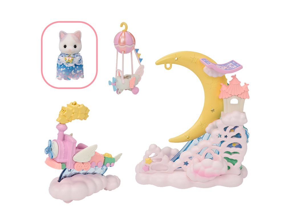 A felhőkben zajló parádé épp most kezdődik. A varázslatos, repülő mozdony alakú autó egy hatalmas holdat vontat maga után egy platformon. A készlet tartalmaz egy aranyos baba figurát a Latte macskacsaládból. A kis Nicolo, aki egy hullócsillag jelmezben van, kényelmesen ül a holdhoz rögzített, lengő léggömb repülőgépben. Lovaglás közben a hold finoman megbillen, ami megrázza a léggömb repülőgépet. A Sylvanian Families felhőparádé elemei összekapcsolhatók, vagy külön-külön is játszhatók velük. A Sylvanian Families játékok fejlesztik a képzeletet és ösztönzik a gyermekeket a szerepjátékra. A figurákkal való játék fejleszti a kreativitást, és tanítja az érzelmeket a mindennapi élmények és a világ megfigyelése alapján történő történetek alkotásával és elmesélésével. Legmagasabb minőség és kivételes figyelem a részletekre jellemzi őket. A Sylvanian Families figurákat puha velúr borítja, és mozgatható végtagokkal és fejjel rendelkeznek. Dobozba csomagolva. Csomagolási méretek: 23 x 26 x 10 cm. Életkor: 3+