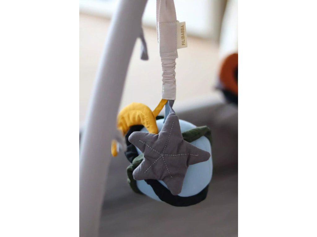 Tépőzáras rögzítéssel a pánton, amely lehetővé teszi a tevékenységi játék használatát a Filibabba fészekben finom tevékenységekhez, a pelenkázóasztal felett vagy a gyermekülésen. Finom játék, amely serkenti a gyermek látását és hallását, és fejleszti a gyermek finommotoros készségeit.