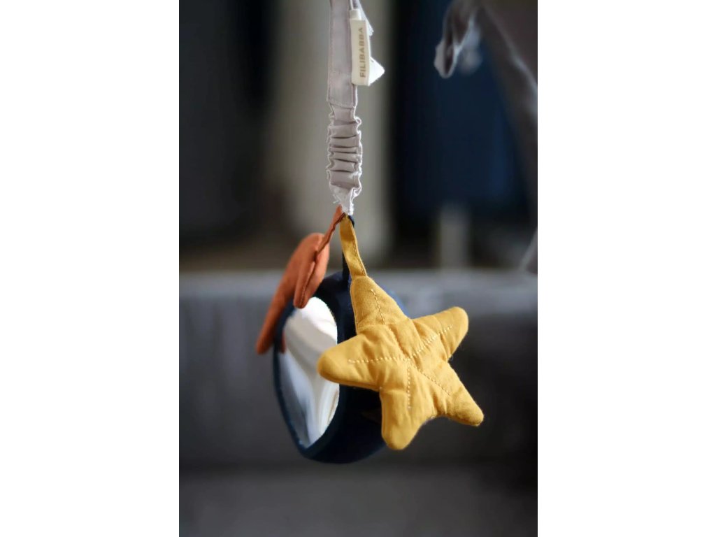 Játék a tevékenység és a motoros készségek fejlesztésére, skandináv természet ihletésével, 100% organikus pamutból. A kerek bolygót egy kis csengővel – csörgővel tervezték belül, amely kellemes hangot ad rázáskor. A csillag puha és kellemes a simogatáshoz, a legkellemesebb ropogó hangokkal, valamint egy tükörhatású félgömb, amely gyorsan felkelti a gyermek figyelmét.