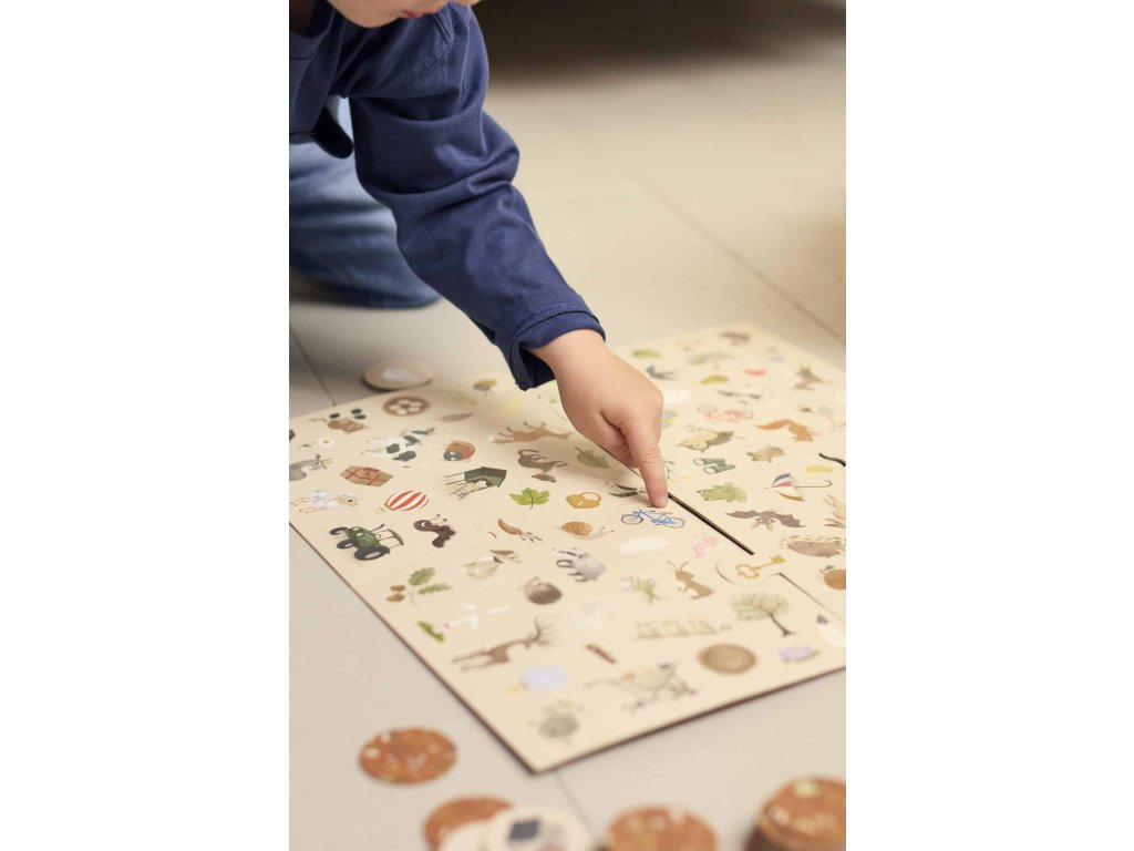A játéktábla 40×40 cm-es, és 4 nagy puzzle darabból áll, így könnyen össze- és szétszerelhető. Minden lapka 4,5 cm méretű – ideális a kis kezek számára.