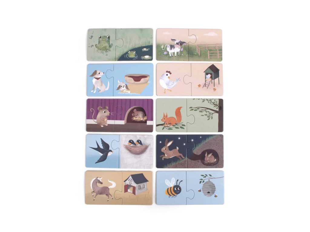 Az új puzzle készlet tíz kis kirakót tartalmaz két nagy darabbal. Élvezze a színes, kézzel rajzolt illusztrációkat, amelyek különböző állatokat és otthonaikat ábrázolják. A rejtvények biztosan felkeltik az érdeklődést a téma iránt, hogy valójában mit jelent az „otthon” szó.