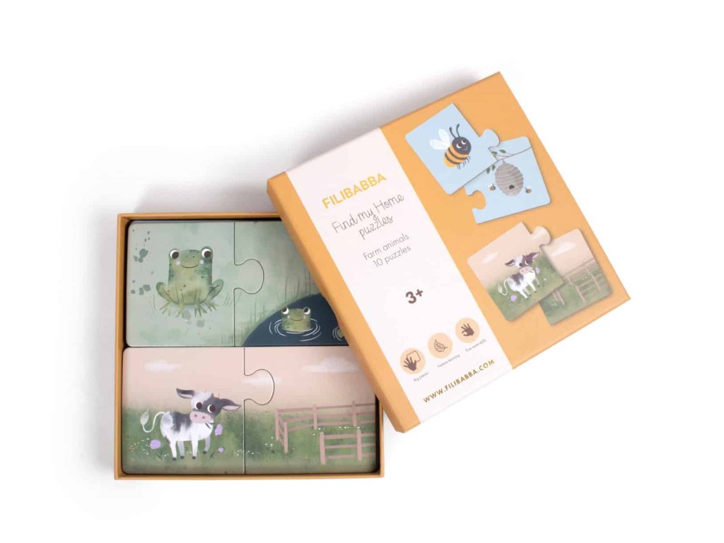 Állatos és otthonos motívumú puzzle, ideális a finommotorika gyakorlásához.
