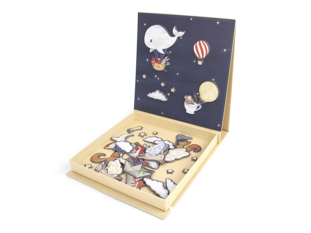 A lenyűgöző csillagos égbolt háttérrel ez a varázslatos mágneses játék arra ösztönzi a gyerekeket, hogy saját mesebeli jeleneteket alkossanak. A színes, kézzel rajzolt figuráknak és a játékos elemeknek köszönhetően tökéletes kombinációja a képzelet fejlesztésének, a történetmesélésnek és a finommotorikának. Praktikus dobozba csomagolva, beépített mágneses táblával, így könnyedén magaddal viheted utazásaid során, és minden darab biztonságosan a helyén marad.