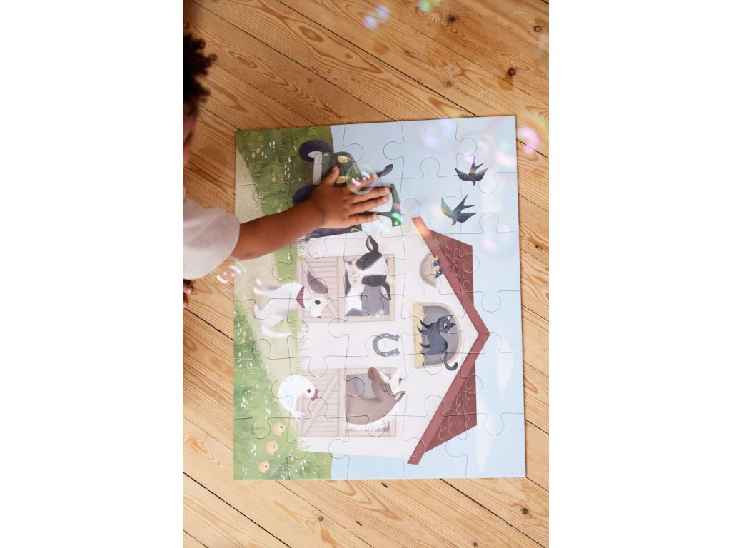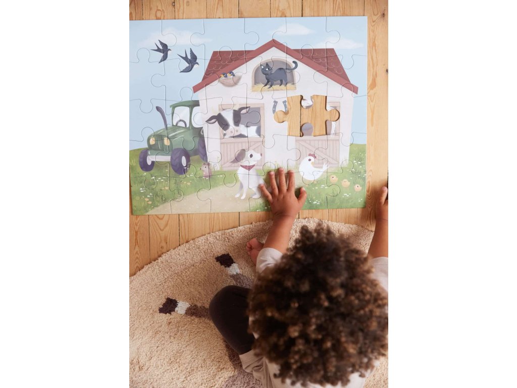 A nagyméretű puzzle 30 nagyméretű darabot tartalmaz, színes, kézzel rajzolt illusztrációval, amely egy aranyos gazdasági állatokkal teli pajtát ábrázol. A puzzle pajta alakú dobozban érkezik, amely dekoratív megjelenésű lesz, amikor nem használják.