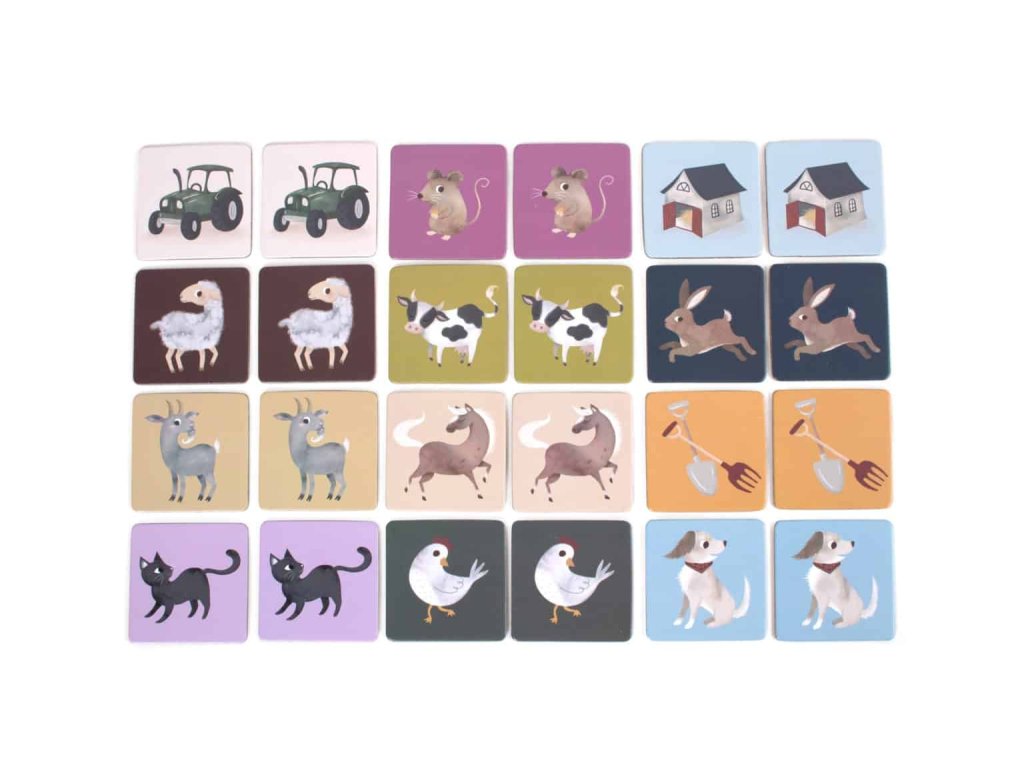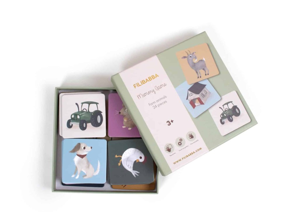 A FILIBABBA memóriajáték 24 kártyát tartalmaz színes, kézzel rajzolt illusztrációkkal, amelyek a legaranyosabb farmon élő állatokat ábrázolják, és biztosan felkeltik a kicsik és nagyok kíváncsiságát.