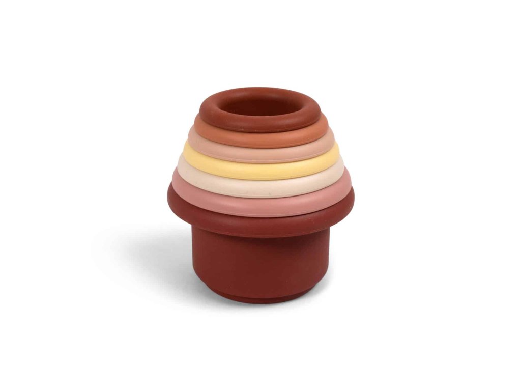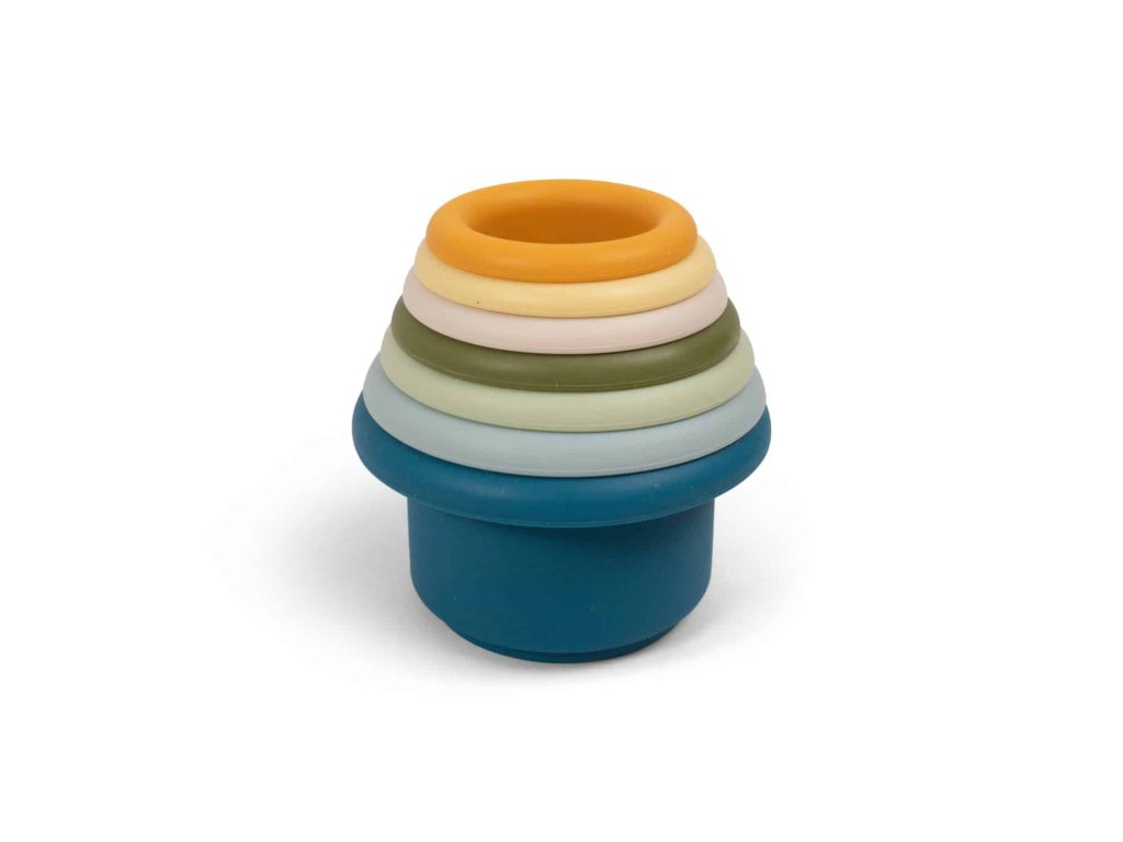 Ez a rugalmas, egymásra rakható játék tartós és szuper puha szilikonból készült, amely könnyen mosható mosogatógépben is.