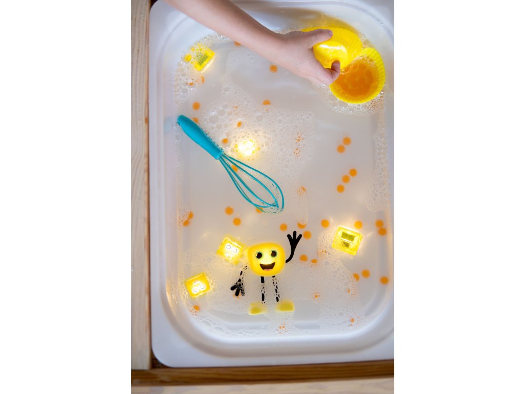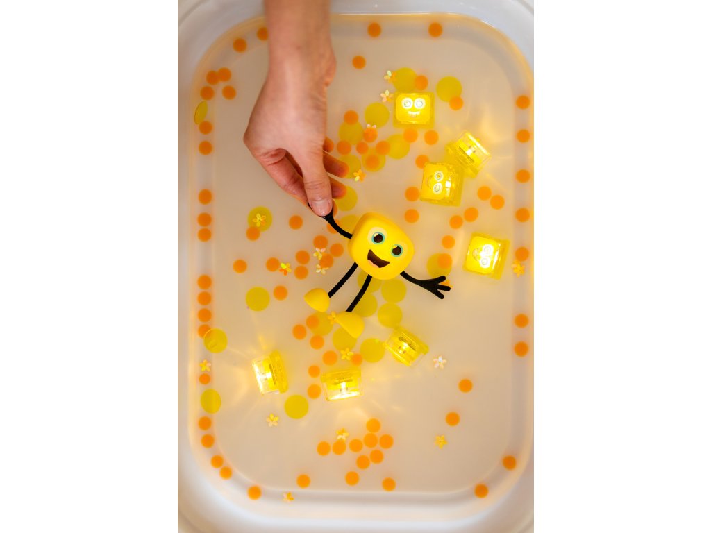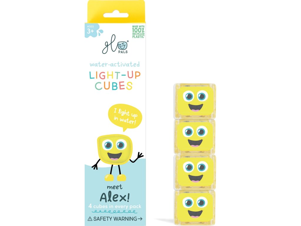 Szenzoros világító kockák vízbe Alex Szórakoztató fürdés tele színekkel a Glo Pals érzékszervi kockáival Fedezze fel a fények és a szórakozás varázsát a Glo Pals Szenzoros világító kockákkal vízbe Alex! Ezeket az egyedi világító kockákat úgy tervezték, hogy minden fürdést a fényekkel és nevetéssel teli kalanddá varázsoljanak. Egyszerűen merítse őket a vízbe, és nézze meg, ahogy sárga fénnyel világítanak, amely tükrözi Alex alakjának színét.Miért válassza a Glo Pals szenzoros kockákat? Szórakozás és tanulás egyben: A kockák támogatják az érzékszervi képességek, a finommotorika és a színfelismerés fejlesztésétBiztonság az első helyen: Az elemek hermetikusan le vannak zárva ultrahangos hegesztéssel, ami kiküszöböli a kinyitásuk vagy lenyelésük kockázatátHosszú élettartam: Minden kocka körülbelül 12–16 órán át világít aktív használat mellett, ami 20–30 fürdőnek felel megÖkológiai megközelítés: Újrahasznosított anyagokból készültek és természetbarát papír csomagolásban vannak csomagolvaTöbb, mint egy játék a fürdőkádba Színterápia: A különböző fényszínek befolyásolhatják a gyermek hangulatát – a kék megnyugtat, a sárga ösztönöz és a zöld nyugalmat hozLélegzetelállító tevékenységek: Készítsen világító palackokat vízzel, flitterekkel és csillámokkal a vizuális stimulációhozJáték szárazon: Az elemek lemerülése után a kockák használhatók színek válogatására, tornyok építésére vagy játékautók terheléséreNéhány praktikus információ Minden használat után: Vegye ki a kockákat a vízből, öblítse le, csepegtesse le a felesleges vizet és hagyja levegőn megszáradniÉrzékelők tisztítása: Ha a fény gyengül, óvatosan tisztítsa meg a fém érzékelőket puha ruhával vagy vattapamaccsalNincs olaj a fürdőbe: A magas olajtartalom bevonhatja az érzékelőket és megakadályozhatja, hogy észleljék a vízzel való érintkezéstTárolás: Tárolja száraz és szellőző helyen, hogy meghosszabbítsa az élettartamukatIdeális ajándék 3 éves kortól A Glo Pals Szenzoros világító kockák vízbe Alex tökéletes ajándék azoknak a gyermekeknek, akik szeretik a fürdést, a fényeket és a kalandokat. Hozza haza ezt a szórakoztató és oktató játékot, amely nemcsak a fürdőszobáját, hanem a gyermekek szemét is beragyogja!