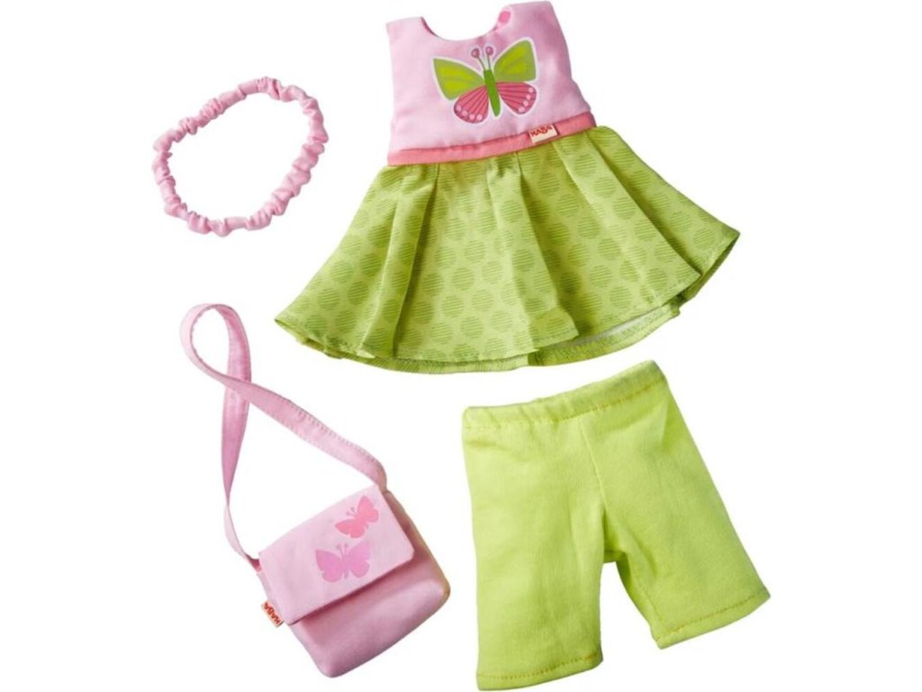 Tartalom: 1 ruha, 1 nadrág, 1 kézitáska, 1 hajpánt. légies, könnyű, tavaszi szett, színben összehangolva a meleg napokra, egyszerű fel- és levétel a friss megjelenésért, 4 mosható rész, amely minden 30 cm-es HABA babához illik