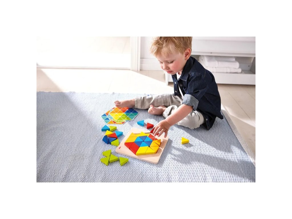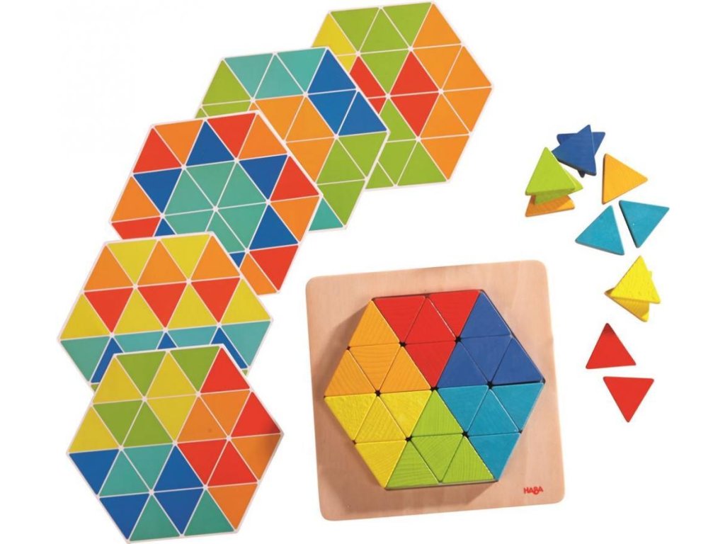 A csomag 36 darab fából készült háromszöget tartalmaz hat élénk színben, melyek egy fa keretlapban vannak elhelyezve, és tetszőlegesen csoportosíthatók, akár minta, akár egyéni design alapján.