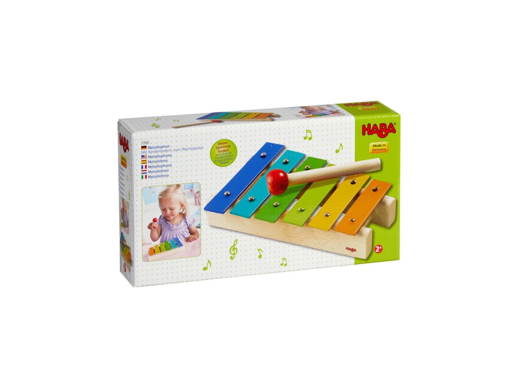 A xilofon a gyermek első hangszerei közé tartozik. A metallofon 2 éves kortól alkalmas kisgyermekek számára, betekintést nyújt a hangok szerkezetébe. Robusztus, német gyártmányú bükkfából és szilárdan rögzített színes hanglapokból áll. 11 gyermekdalt tartalmaz, támogatja a szem-kéz koordinációt, a finommotorikát, valamint a ritmusérzéket és a zenei fejlődést. Szép bevezetés a zene világába 2 éves kortól.