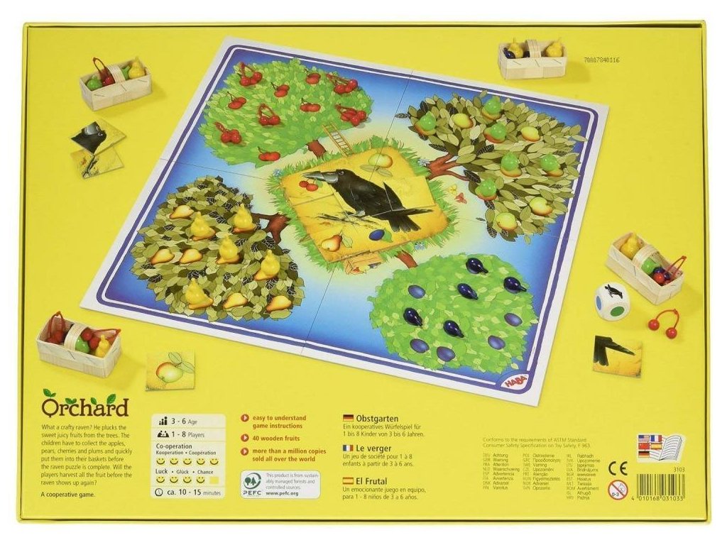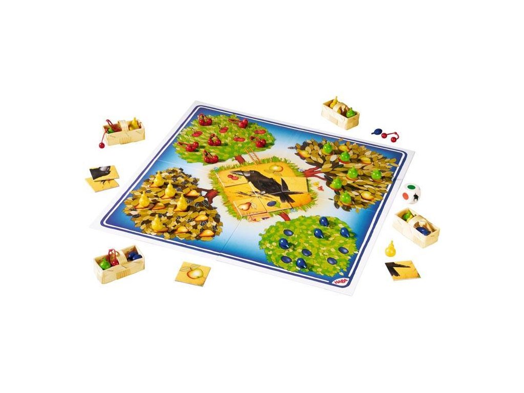 Könnyen érthető, kooperatív társasjáték 3-6 éves gyermekek számára. A gyümölcsössel fák tele vannak gyümölcsökkel, a játékosok feladata, hogy megvédjék őket a szemtelen hollótól.