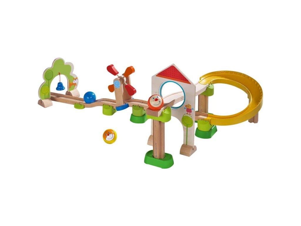 Fából készült golyópálya sok szórakoztató részlettel.