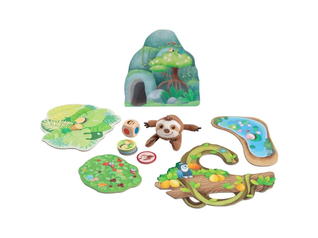 A játék tartalma: 1 lajhár, 5 kedvenc hely, 5 darab, 1 kocka és a játékszabályok.