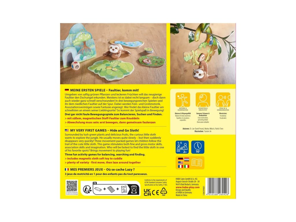 Három szórakoztató akciójáték egyensúlyozáshoz, kereséshez és megtaláláshoz 1–5 gyermek számára, 2 éves kortól. Egy játék időtartama kb. 10 perc. Az egyensúlyozó játékban (eredeti név: My Very First Games – Hide and Go Sloth!) a gyerekek a plüss lajhárt helyről helyre viszik, és megismerkednek az első szabályok szerinti játékkal. A keresőjáték mozgásra ösztönzi a gyerekeket. Ezenkívül megfigyelőképességet és éleslátást is igényel. A játék azonban elsősorban szórakozás, és a tanulás természetesen és szinte magától megy végbe! Élvezzétek a szórakozás szép pillanatait gyermekeddel!