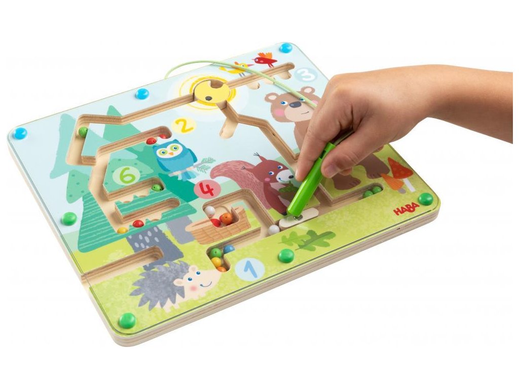 Ki ne szeretne sétálni az erdőben? A kis felfedezők a mágneses toll segítségével apró, színes golyókat mozgathatnak a fák lombjai között és az erdő aljnövényzetén át a megfelelő erdei állathoz.