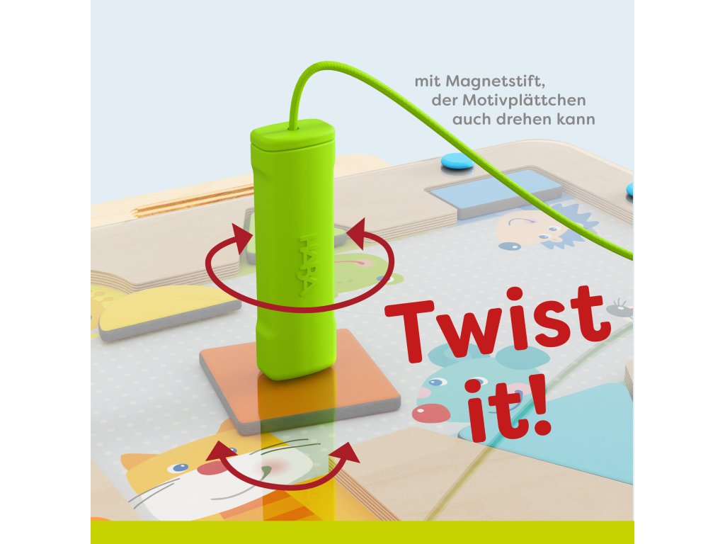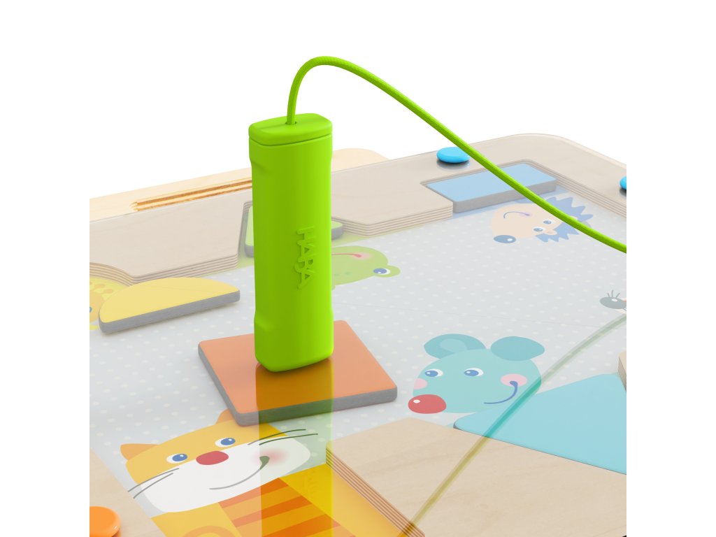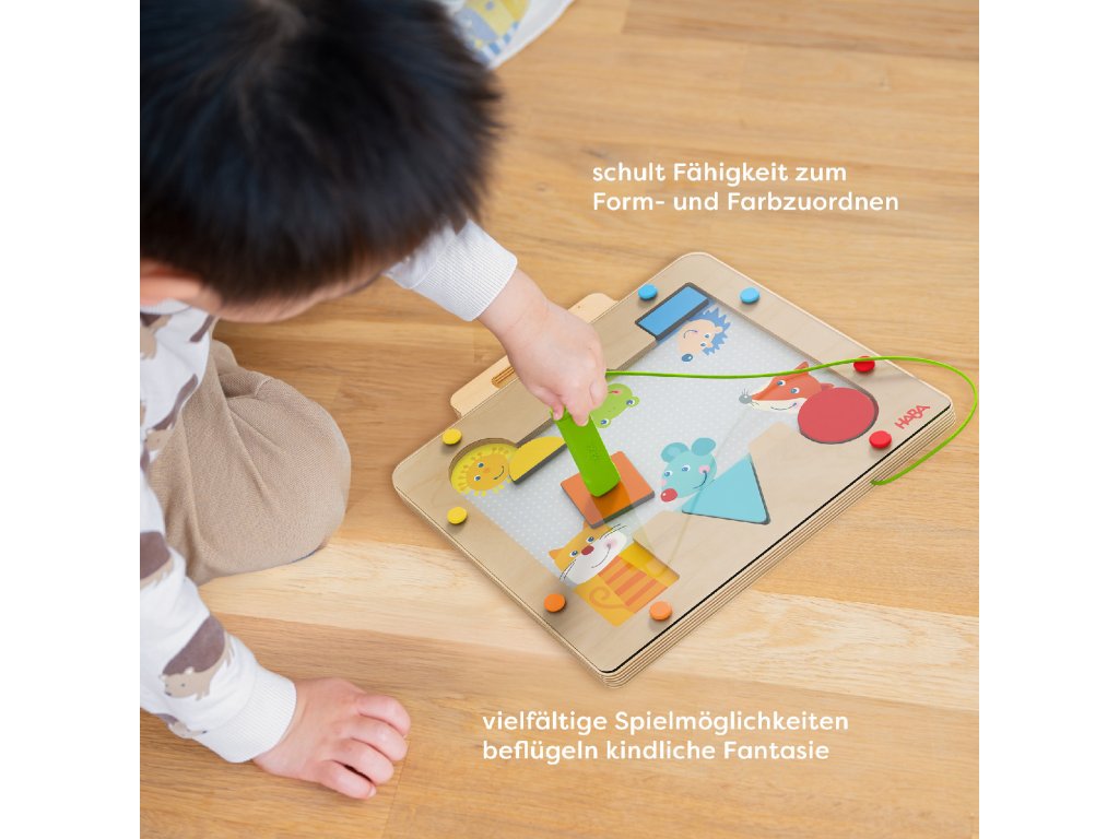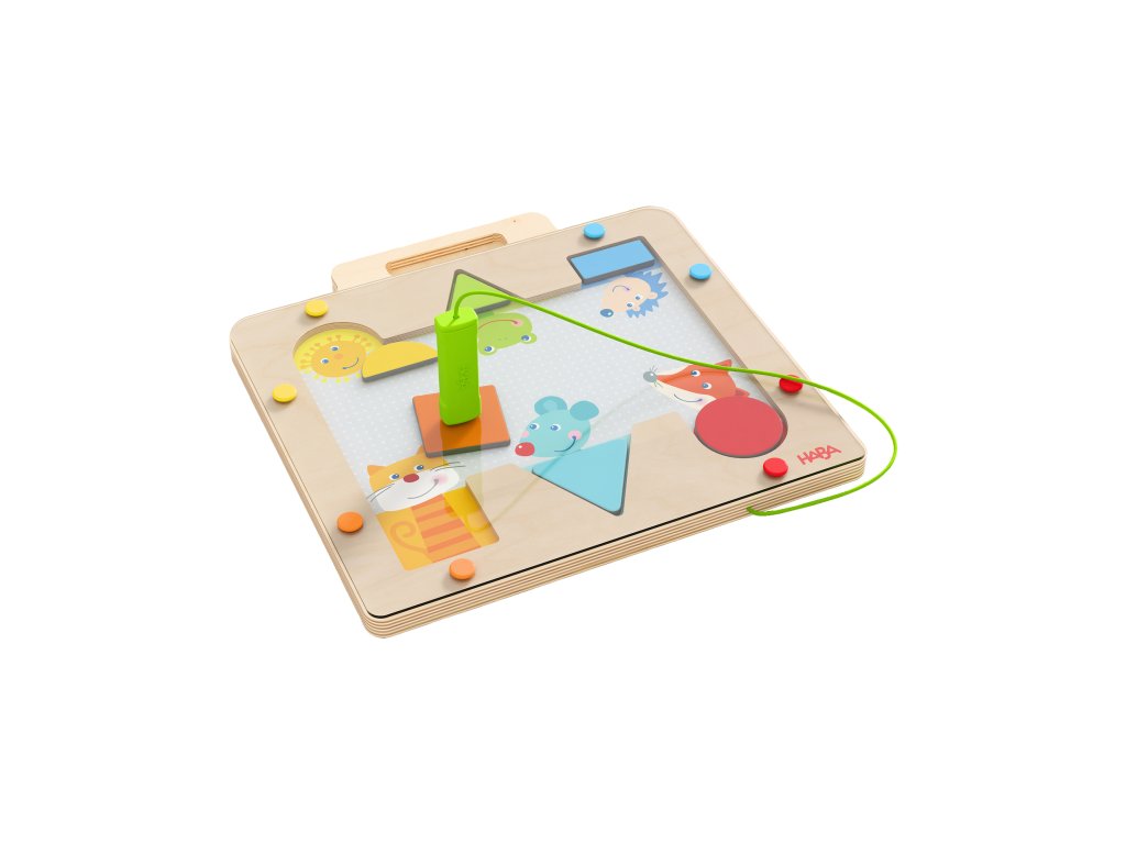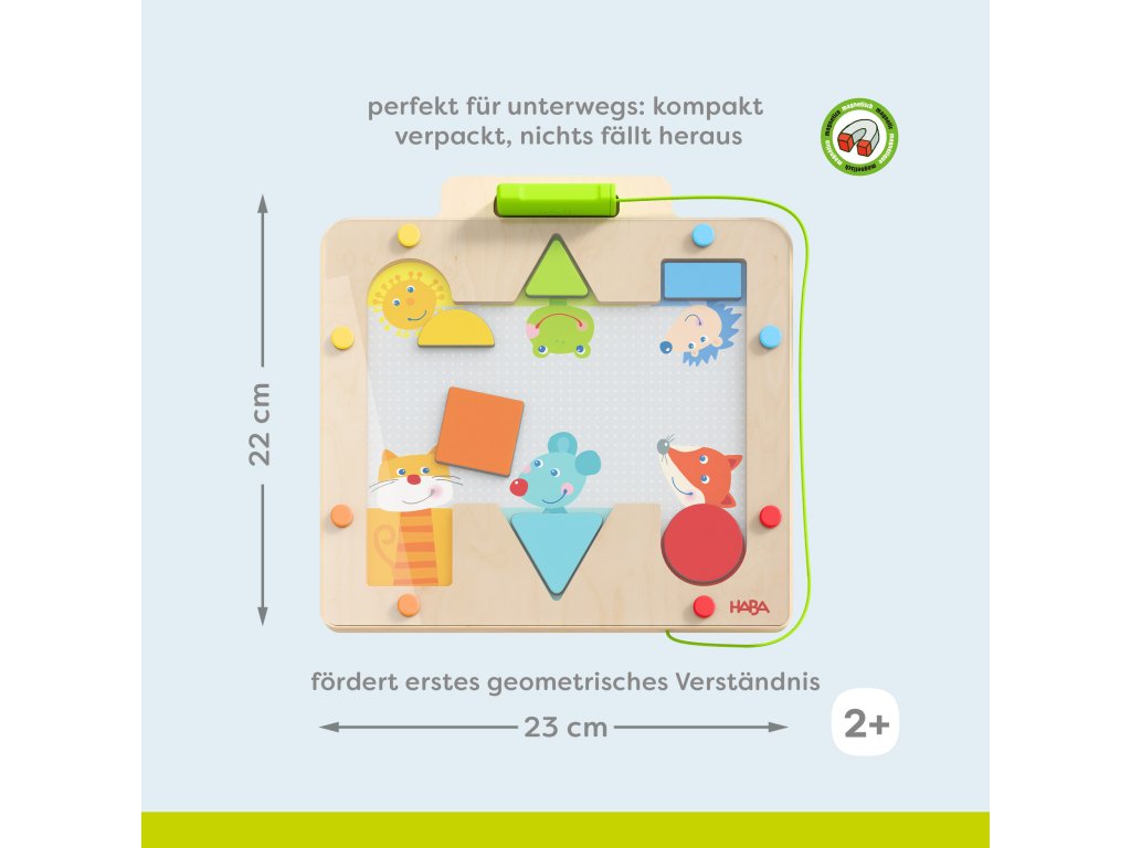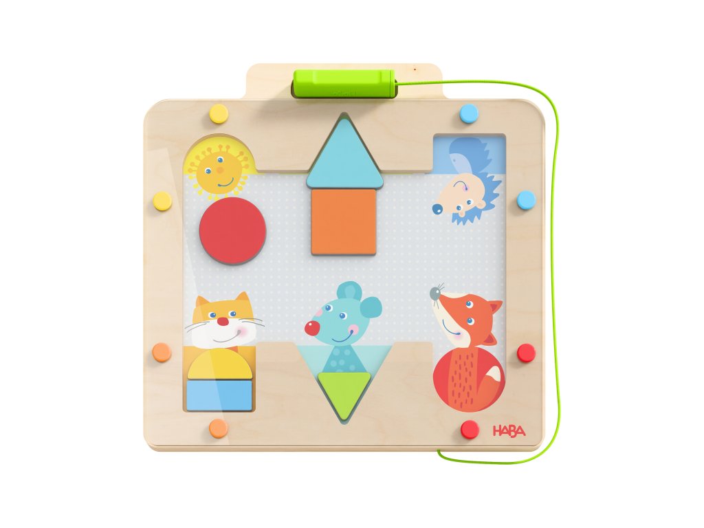 A mágneses toll segítségével a gyerekek könnyen a helyükre mozgathatják a geometriai képekkel ellátott lapkákat. A legjobb rész? A gyerekek válogathatnak szín vagy forma szerint – mivel elegendő hely áll rendelkezésre a mágneses formák 360°-os irányú elforgatásához.