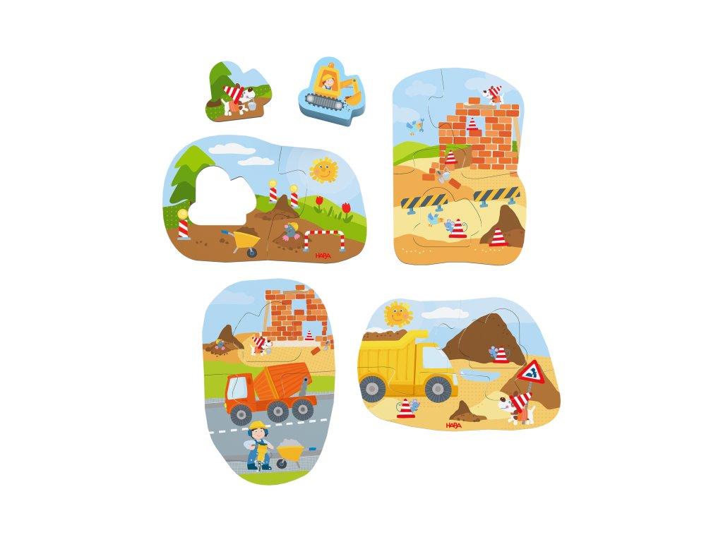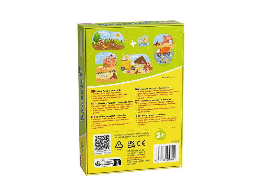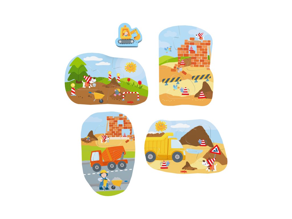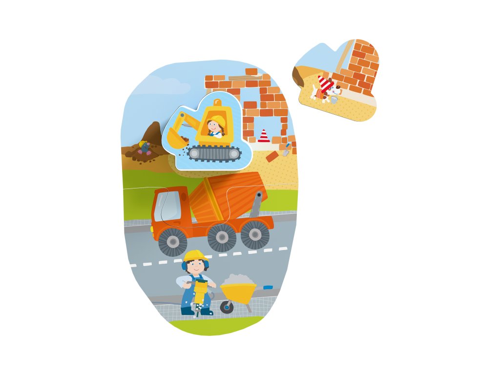 A 4 darabos, fa figurával ellátott „Építkezés” puzzle készlet ideális kezdés a 2 éves kortól kezdődő gyermekek számára.