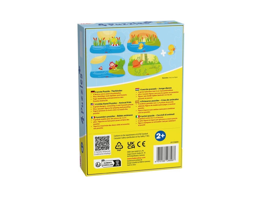 A készlet 4 puzzle-t és egy „Állatkölykök” témájú fafigurát tartalmaz, amelyek ideális bevezetést nyújtanak a 2 éves kortól kezdődő gyermekek számára a kirakók világába.