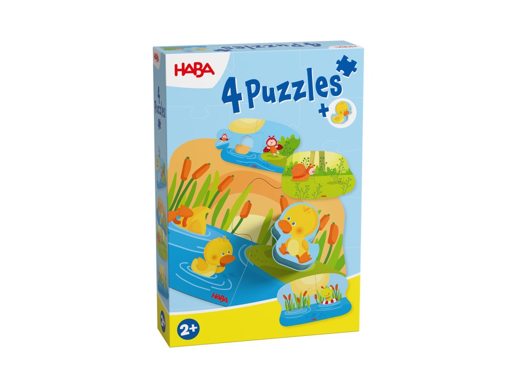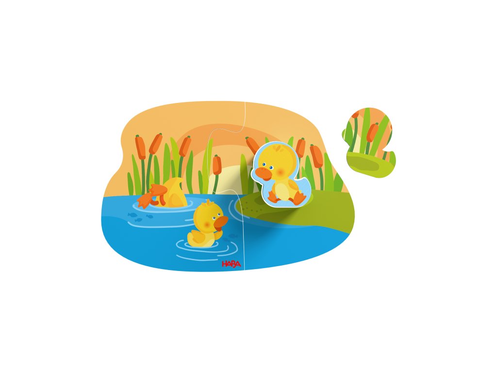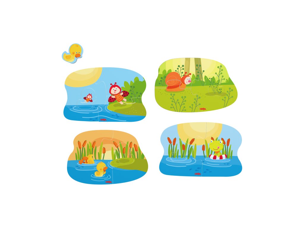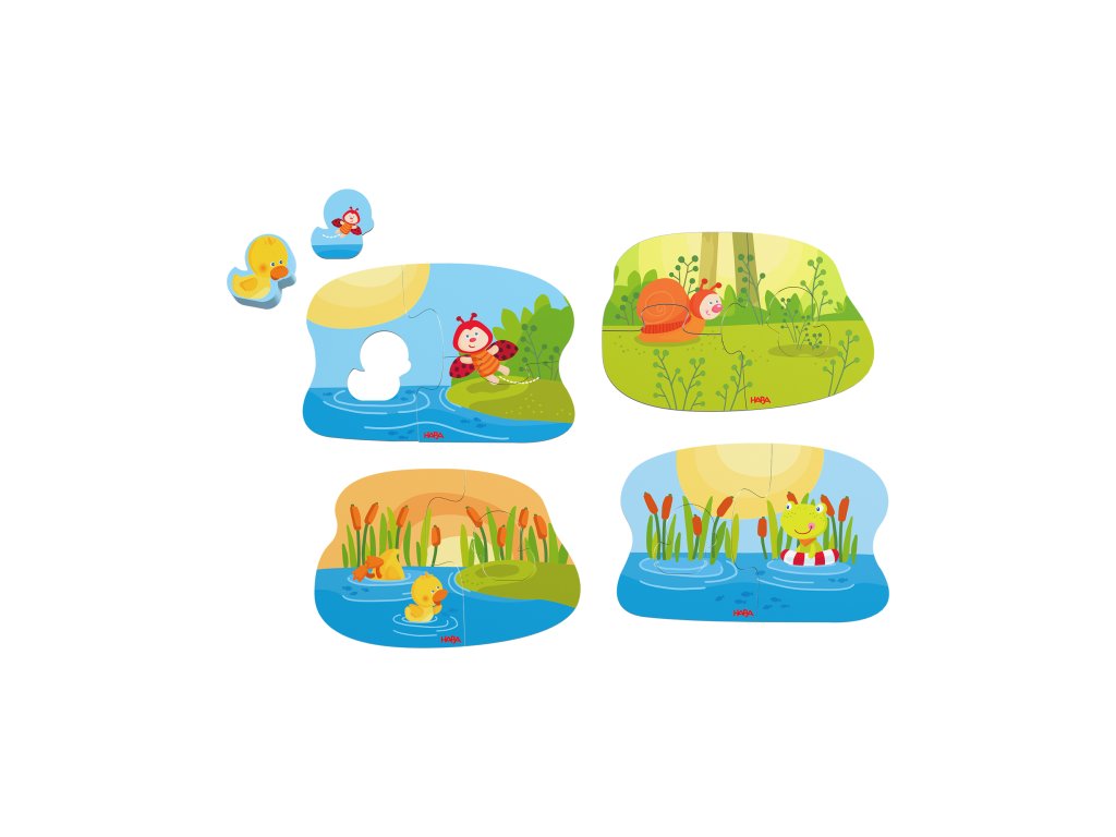 A kiskacsa, a béka, a csiga és a katicabogár aranyos motívumai sok örömet okoznak az első kirakási kísérleteknél. A puzzle-k 2 vagy 3 darab vastag kartonból állnak, amelyek jól megfoghatók a kis kezek számára.