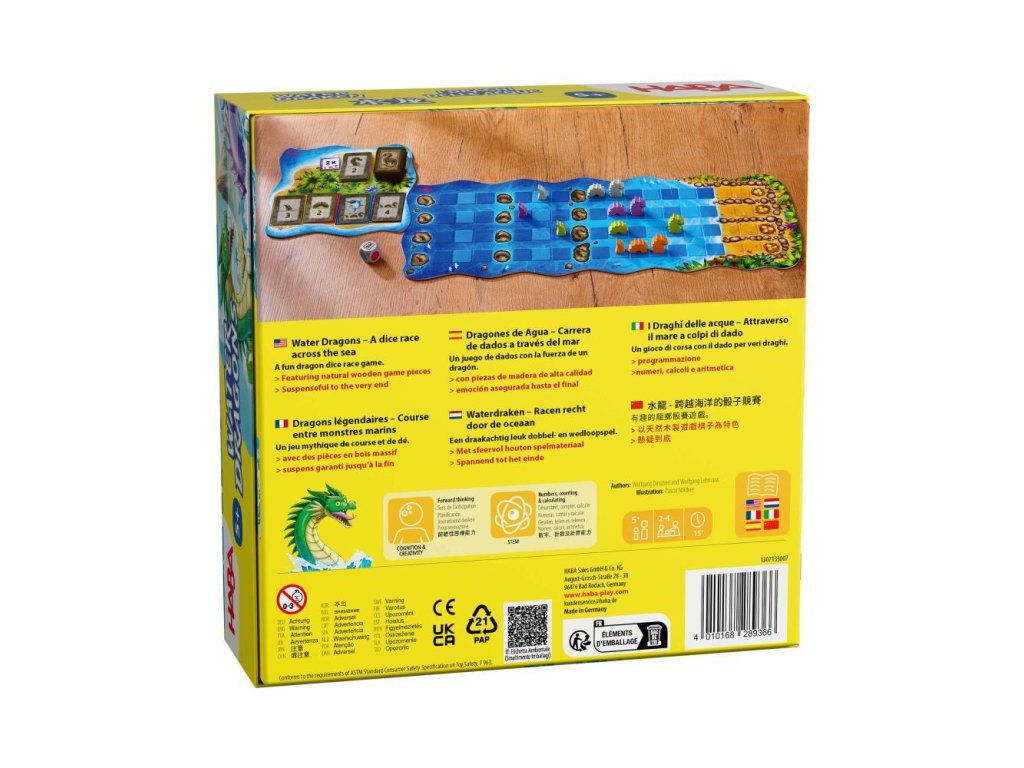 A HABA Water Dragons egy izgalmas társasjáték 5 éves kortól gyermekeknek. Amikor a vízi sárkányok felbukkannak az óceán mélyéről, a gyerekek segítenek nekik eljutni a Sárkány-öbölbe, hogy ott lerakják a tojásaikat. A megfelelő taktikával, a kockákkal való szerencsével és a megfelelő pillanatban kijátszott joker kártyával az adott sárkány különösen gyorsan eléri a célját. De légy óvatos: az öbölbe vezető utat veszélyes cápák keresztezik! Aki elsőként ér a vízi sárkányával az öbölbe, az nyer. Izgalmas családi játék a HABA-tól 5 éves kortól gyermekeknek. A társasjáték taktikát és szerencsét igényel a kockákkal. Az a gyermek nyer, aki elsőként ér a vízi sárkányával a Sárkánybarlangba, és ott lerakja az aranytojásokat. Azonban vigyázz a cápákra az öbölben – elronthatják a játékot minden játékos számára. Feszültség a végsőkig! A fafigurák fenntartható erdőgazdálkodásból készülnek. 2-4 játékos számára, a játékidő kb. 15 perc. Németországban készült. Tartalom: 4 vízi sárkány (mindegyik három részből áll), 1 óceán (háromrészes logikai játéktábla), 1 sziget (kártyatartó), 36 kártya, 1 kocka, 1 játékszabály. 5 éves kortól ajánlottJátékidő 15 perc Játékosok száma 2-4 fő