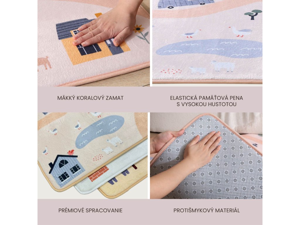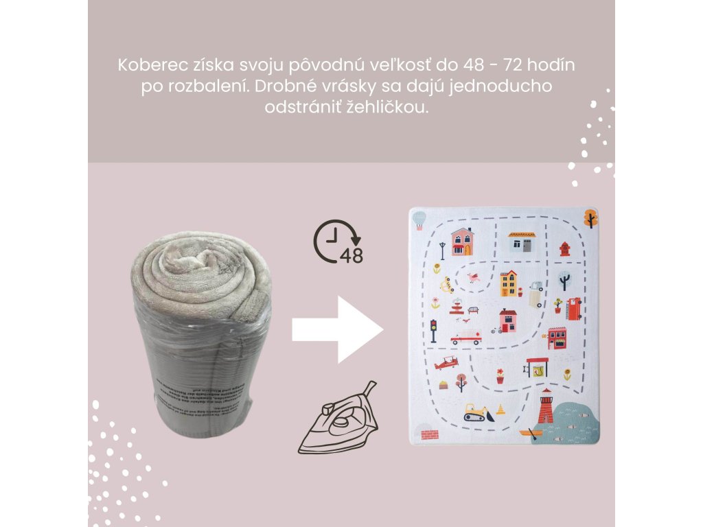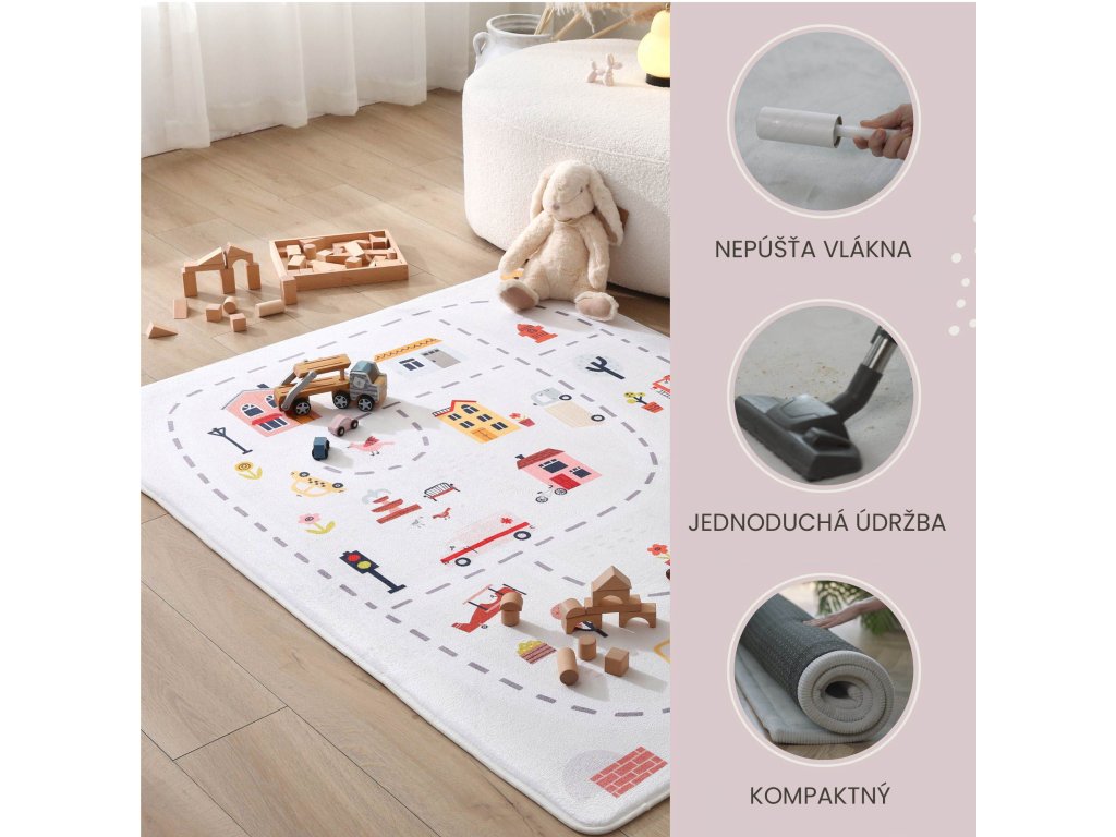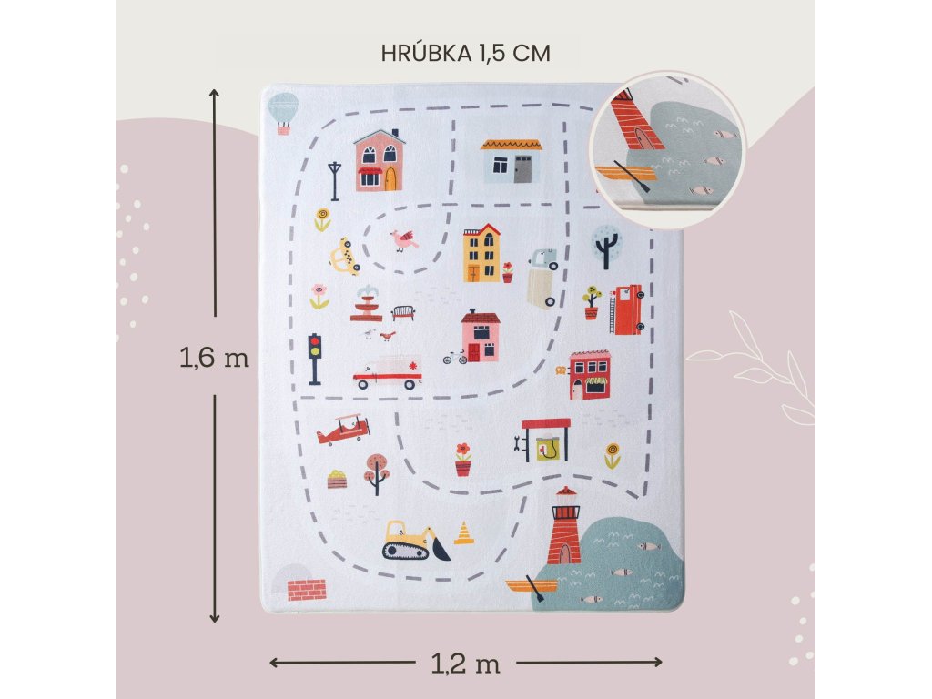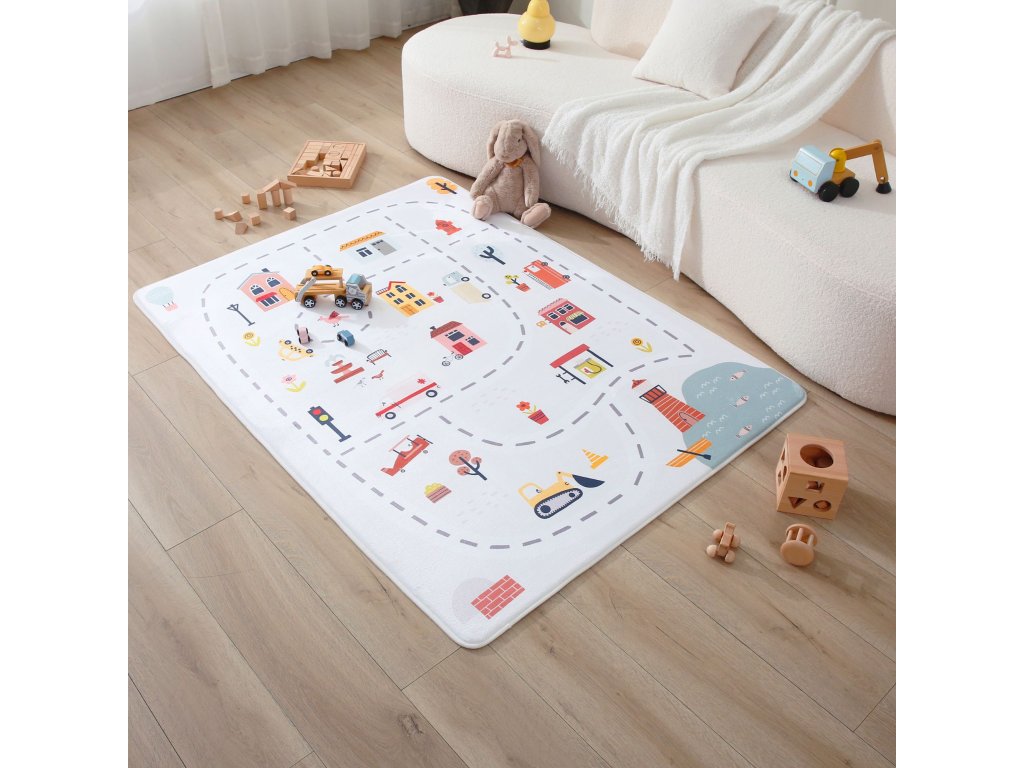 City gyermekszőnyeg 1,6 x 1,2 m Biztonságos és kényelmes hely a játékhoz A City gyermekszőnyeg nagyszerű hely a gyermekek számára a játékhoz, mászáshoz és pihenéshez. Három rétegből áll – puha korallbársonyból, kényelmes, rugalmas memóriahabból és csúszásgátló alátétből, amelyek biztonságos és kényelmes játékot garantálnak a földön. A memóriahab 2 cm vastag, és gyorsan visszanyeri eredeti formáját, ami előny a olcsóbb szőnyegekkel szemben. 160 x 120 x 1,5 cm-es méretével nemcsak a gyerekjátékokhoz elég nagy, hanem jógához vagy pihenéshez is.Stílusos és praktikus kiegészítő otthonába A város motívumú gyermekszőnyeg gyönyörűen kiegészíti a belső teret. Praktikus kialakítása egyszerű gondozást és könnyű karbantartást tesz lehetővé – csak porszívózza fel vagy törölje le nedves ruhával. Ráadásul káros anyagoktól, például BPA-tól és ftalátoktól mentesen készült, így biztos lehet benne, hogy gyermeke biztonságban lesz.