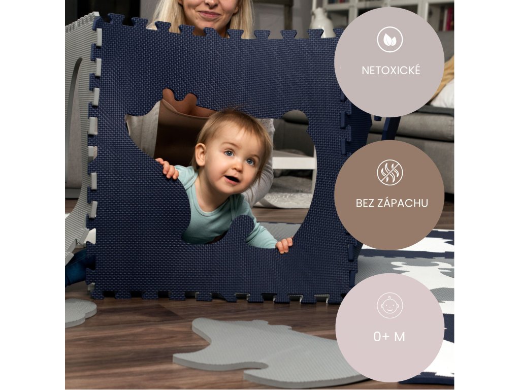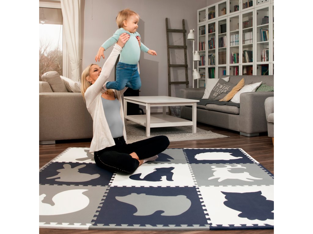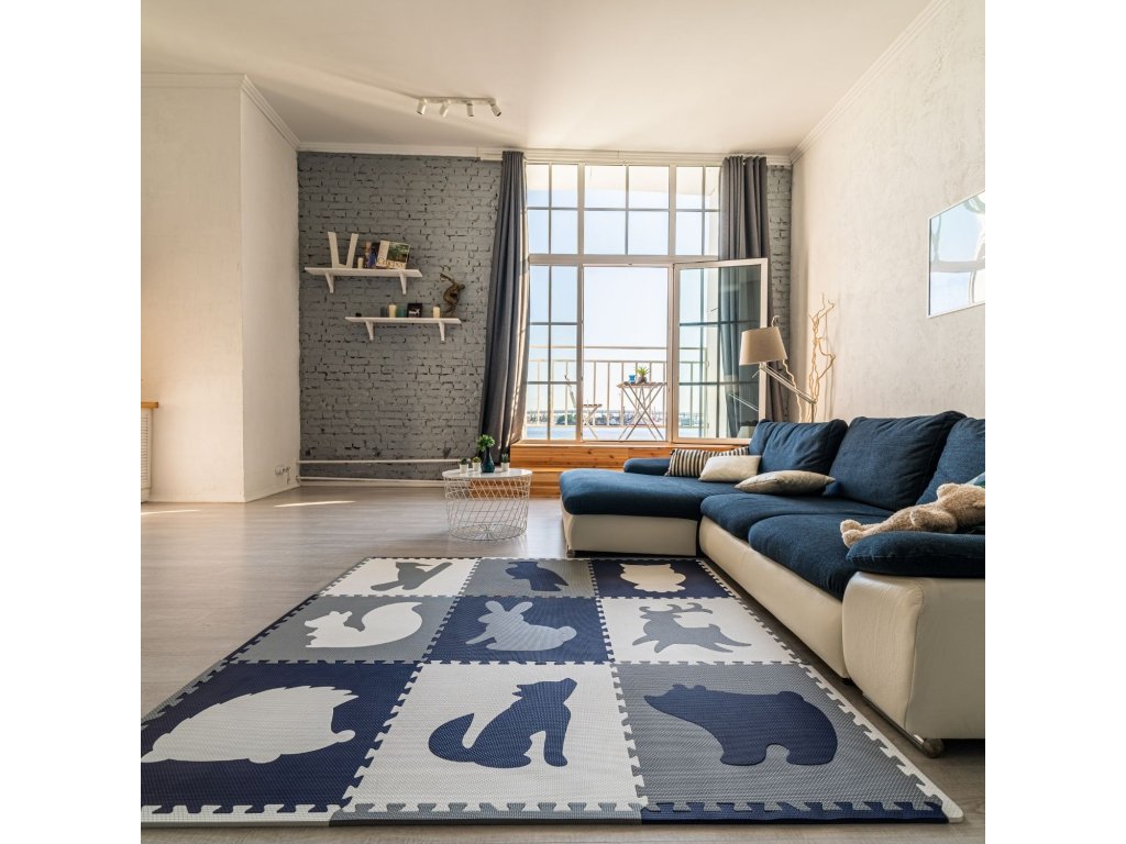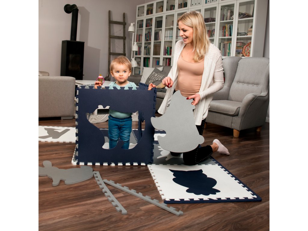 Puzzle XXL Erdei játszószőnyeg 1,8 x 1,8 m Játékos és kényelmes erdei mintás puzzle szőnyeg. Az Extra nagy Puzzle XXL Erdei játszószőnyeg 9 habszivacsból áll, amelyek 4x nagyobbak, mint a klasszikus puzzle darabok, ezért négyszer annyi helyet biztosít nemcsak a mászáshoz, játékhoz és gyermekkalandokhoz, hanem a különféle családi tevékenységekhez is. Használhatja jógához, sportgyakorlatokhoz vagy akár egy piknikhez a természetben. Az elegáns pasztell színek (fehér, szürke, sötétkék) skandináv esztétikát kölcsönöznek otthonának. A biztonságos csatlakozásnak és a nagy, egy darabból álló állatformáknak köszönhetően az összes puzzle darab szilárdan illeszkedik egymáshoz, így kényelmes "párnát" biztosít a kemény és hideg padlókon is.Biztonságos játszószőnyeg a legkisebbeknek A gyönyörű pasztell színekben pompázó játszószőnyeg minőségi EVA habból készült, amely 1,2 cm vastag és 20%-kal puhább és melegebb, mint más alternatívák, ami kényelmes és biztonságos játékot biztosít. A szőnyeg vízálló, és egyszerűen tisztítható szappannal és ronggyal, így nem csak otthon, hanem a szabadban is használhatja. Ráadásul 100%-ban szagmentes, és nem tartalmaz veszélyes anyagokat, mint például formamid, BPA és ftalátok.